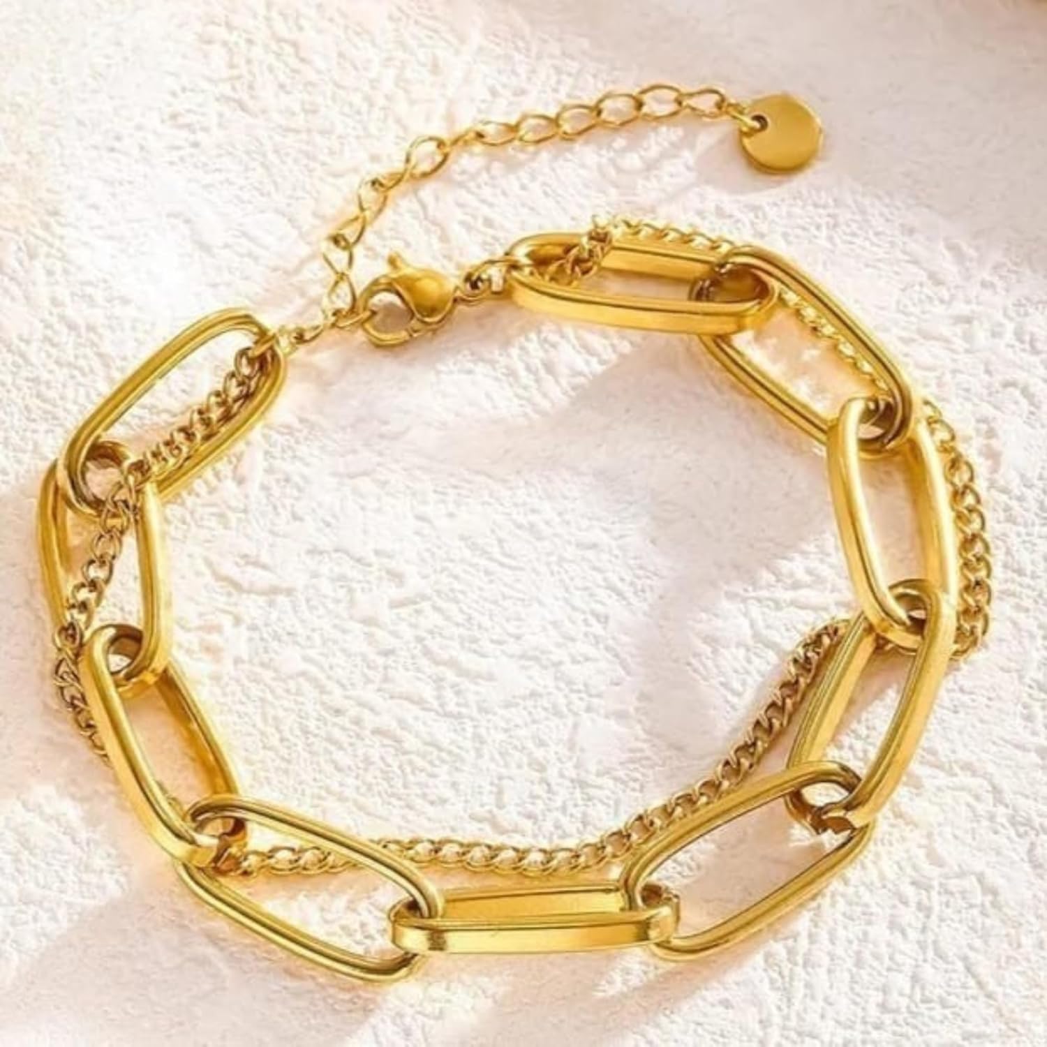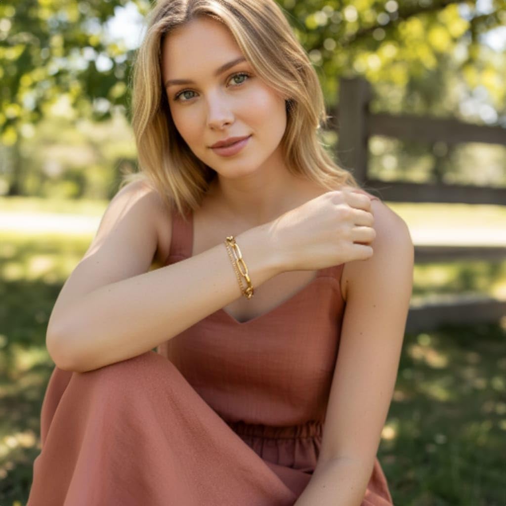 Elevate your style with this exquisite waterproof 18k gold plated bracelet stack. Crafted with precision from premium stainless steel, this dainty layered bracelet features a sleek paper clip design and a double chain for a chic, modern look.