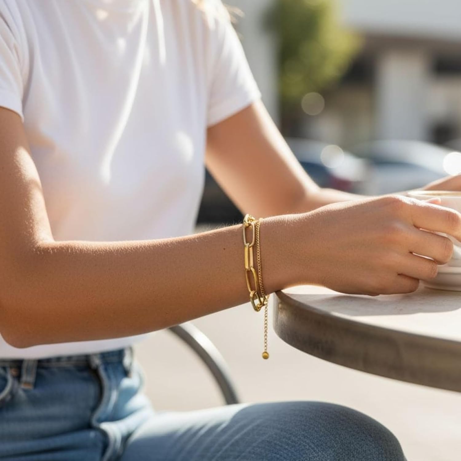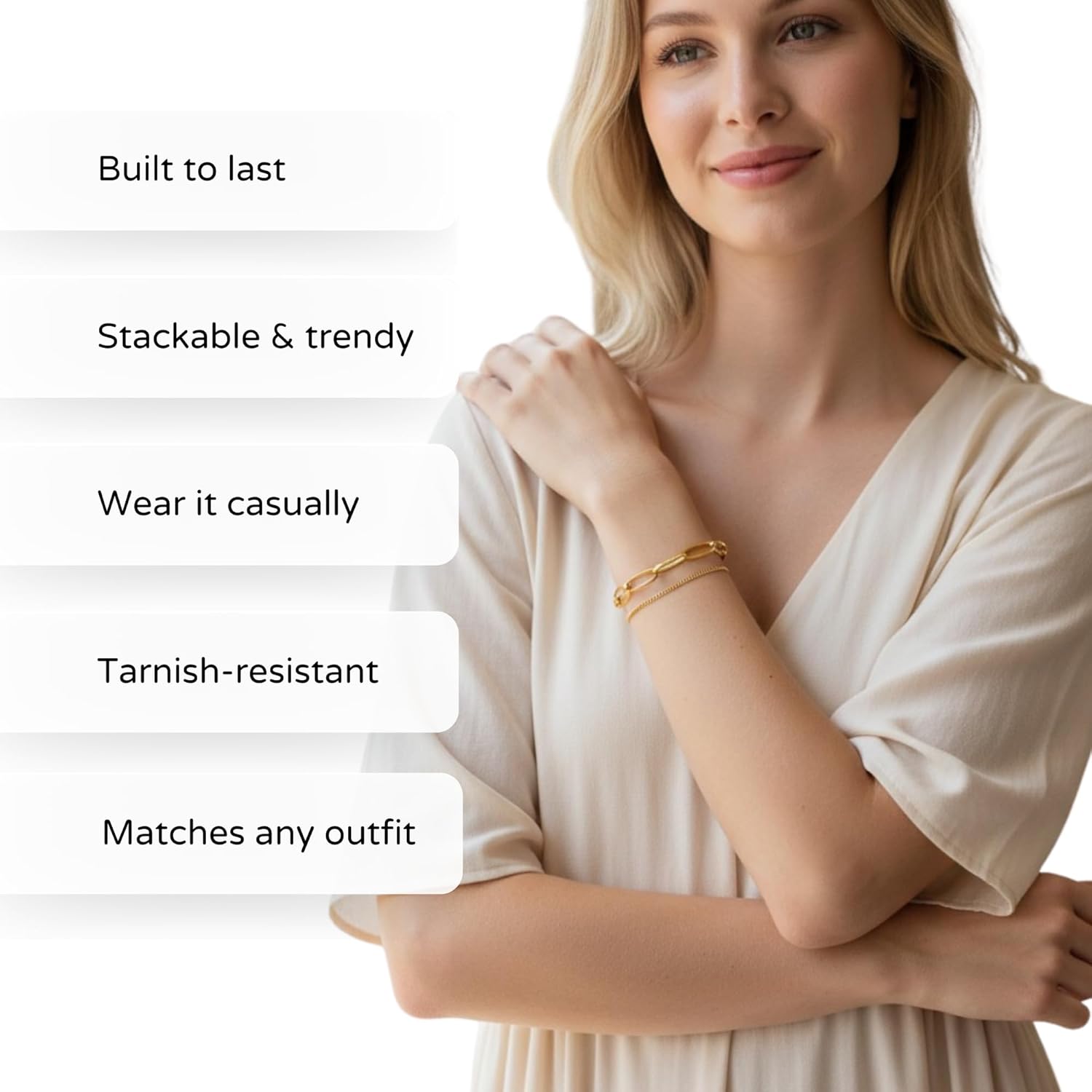 18K Gold Plated Water-Resistant Bracelet Stack for Women – Stainless Steel, Non-Tarnish Layered Paperclip & Double Chain, Adjustable Trendy Jewelry – Gift for Women