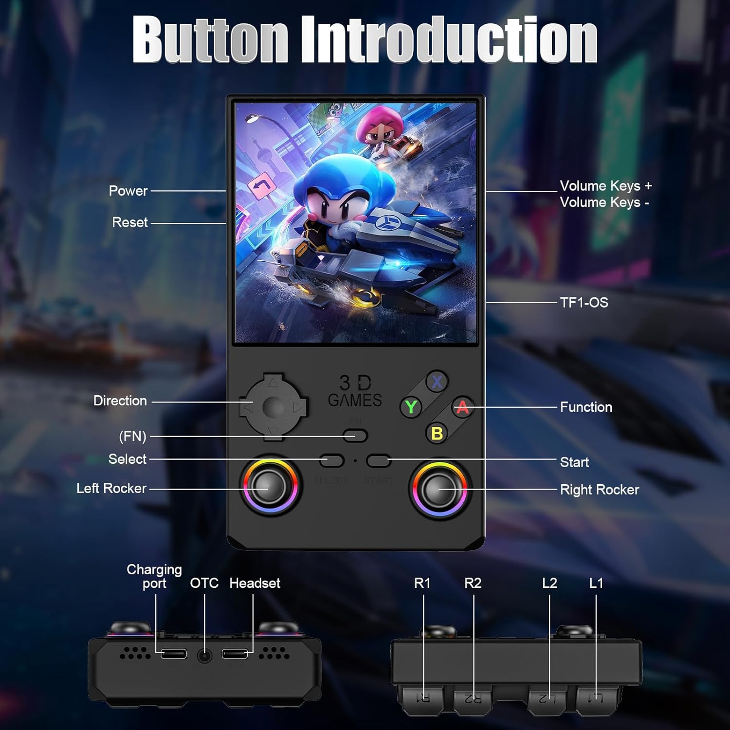 【4.0-inch IPS high-definition screen】The 4.0-inch IPS high-definition full screen ensures error free viewing at different angles, with a resolution of 720 x 720 and clearer RGB colors. The screen is made of upgraded tempered glass, providing sturdy protection and ensuring durability and shatter resistance. Dual 3D joysticks and cool neon lights provide you with a better gaming experience.