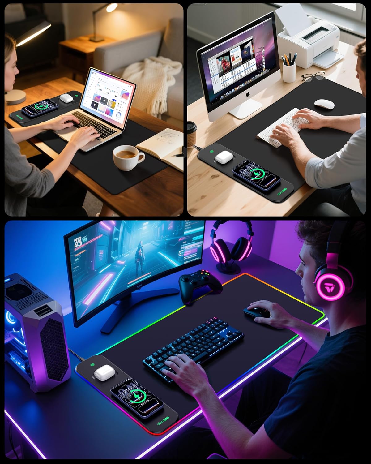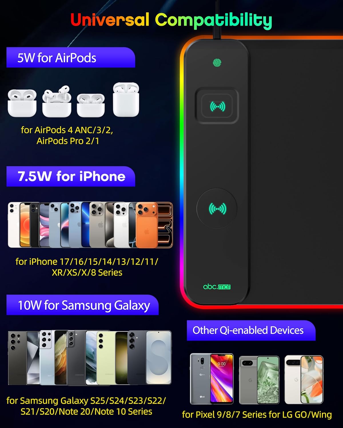 【Smart Safety & Anti-Slip Design】 Built-in Smarship tech prevents overcharging, overheating, and short circuits; Natural rubber base with textured grip keeps the mat firmly in place during intense gameplay