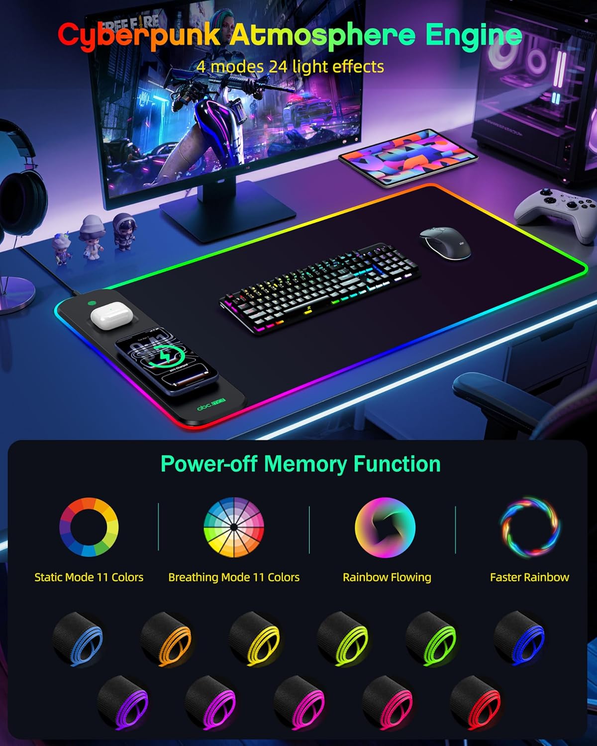 3-in-1 RGB Gaming Mouse Pad with Magnetic Wireless Charging, 31.5″x15.8″ Large, 24 Light Effects, Non-Slip Base, Waterproof Ultra-Smooth Surface, with Adapter