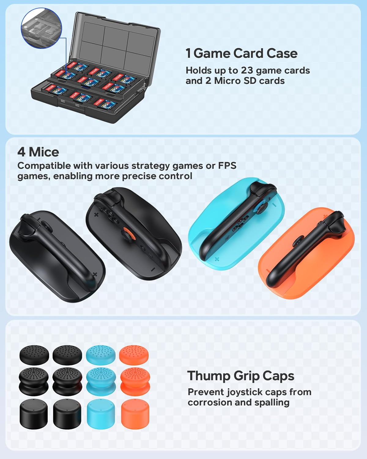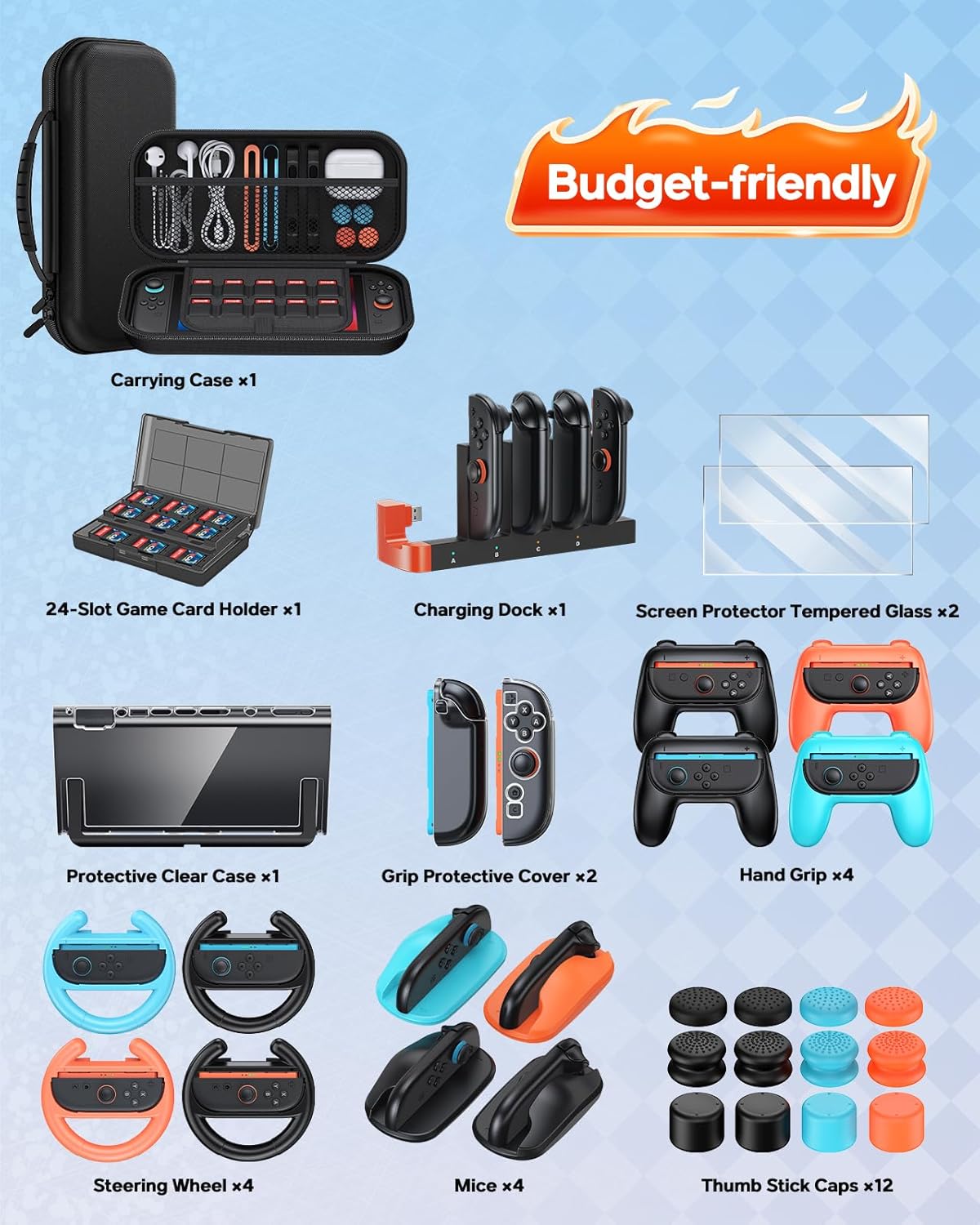 【All-in-One Switch 2 Bundle Kit】 The accessories bundle designed for Nintendo Switch 2 2025. Includes carrying case*1, charger dock*1, console protective shells*1,controller PC covers*2, screen protectors*2, steering wheel*4 for mario kart, hand grip*4, mouse grip*4, thump cap*12, game card case*1.This set covers all your needs, delivering a seamless gaming experience for you and your family, perfect for kicking off endless fun