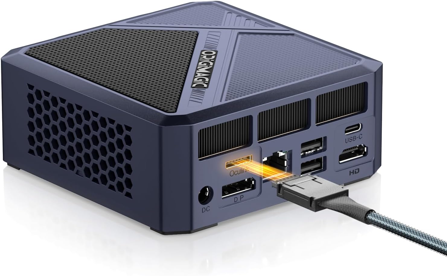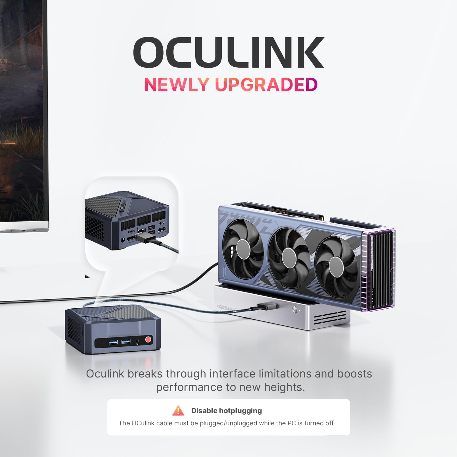 To Connect:1.Power off and unplug the mini PC.2.Firmly attach the OCuLink cable to the mini PC and the external device.3.Turn on the external device’s power first.4.Then, plug in and power on the mini PC.