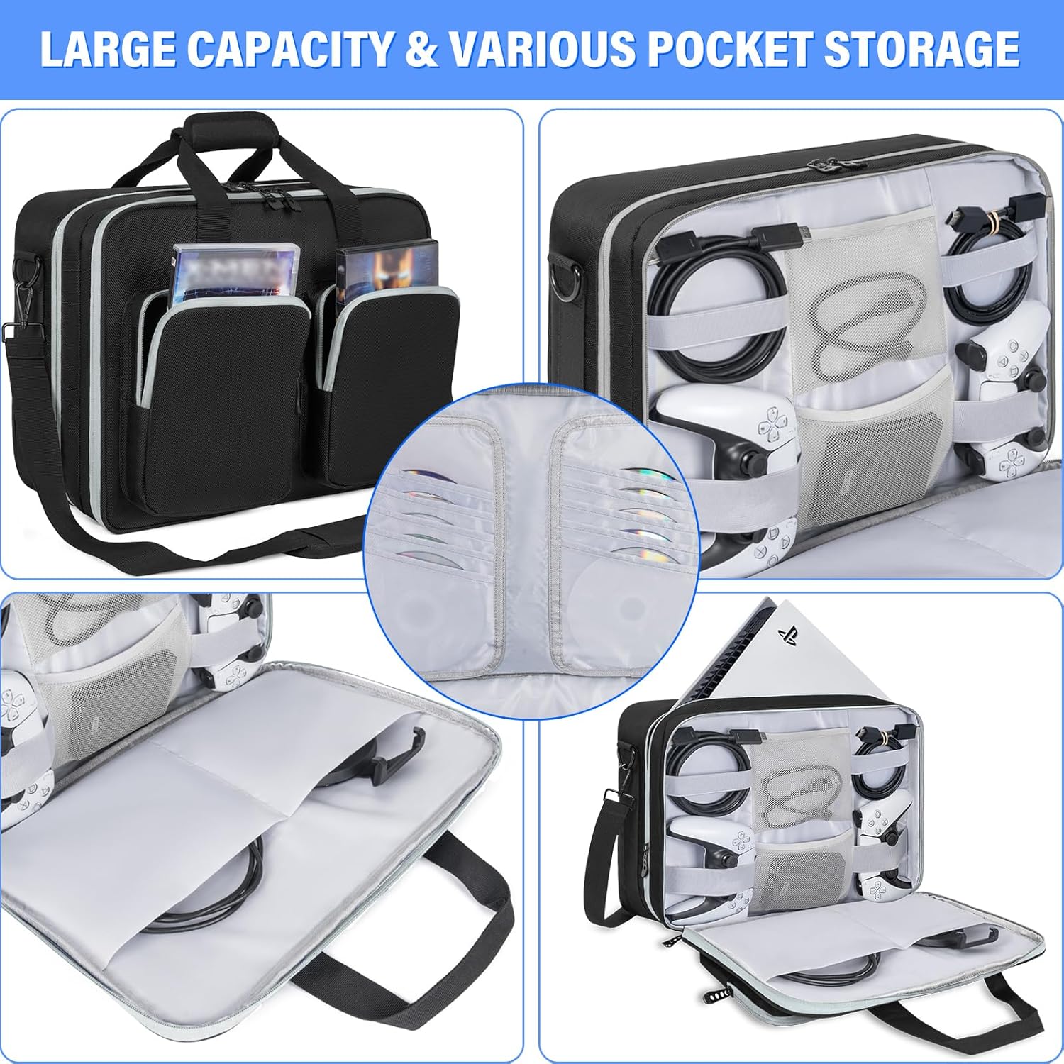 Two Layers Design,First large layer is for your PS5 Console and hold 5 game discs; Second layer have several pockets and elastic band,where can hold your gaming mice controller and other accessories