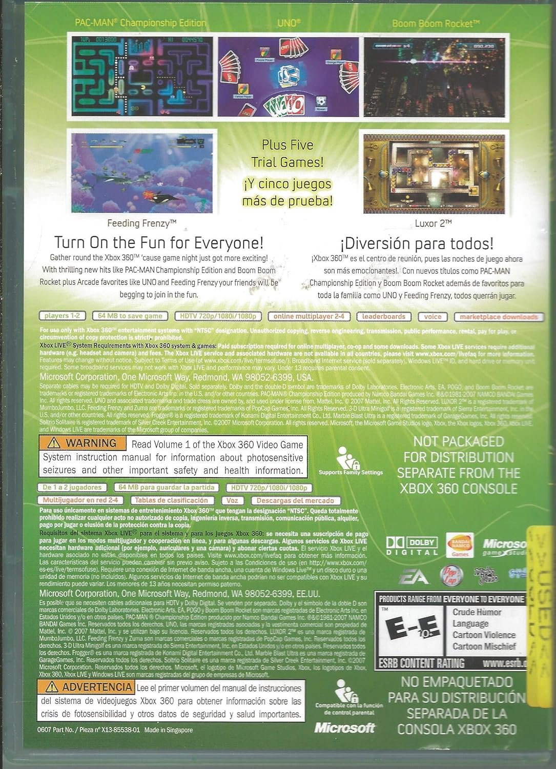 Contains 5 Xbox Live Arcade games on one disc: Pac-Man Championship Edition, UNO, Boom Boom Rocket, Feeding Frenzy, and Luxor 2!