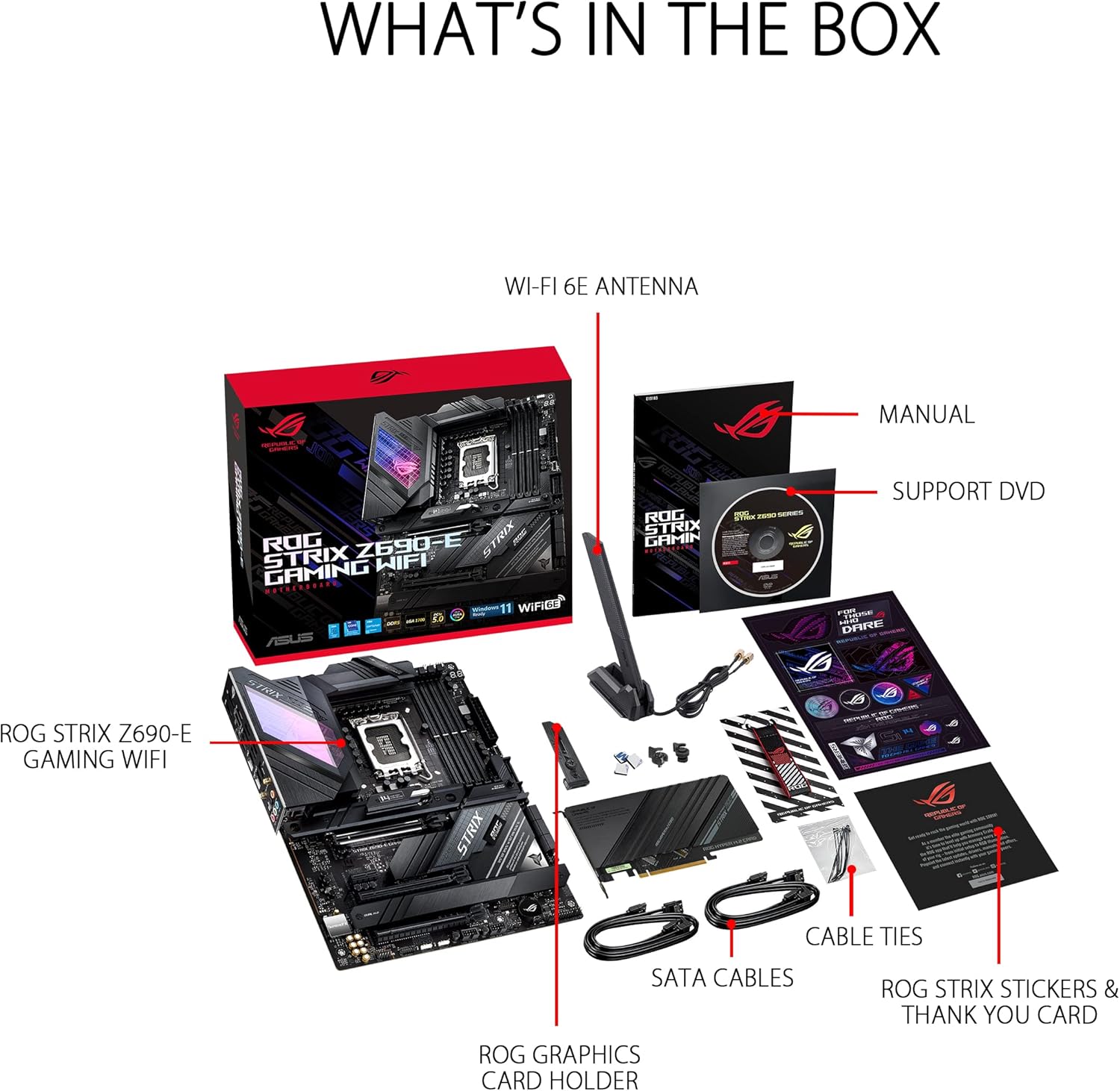 The ASUS ROG Strix Z690-E WiFi 6E Gaming motherboard is designed with 18+1 power stages and optimized cooling to cope with the demands of powerful 12th Gen Intel® Core™ processors. Along with the latest Wi-Fi 6E, DDR5 Memory and PCI Express® 5.0 for superfast data transfer, memory and storage performance, ROG Strix Z690-E Gaming WiFi is unmistakably ROG with its futuristic design elements, iridescent ROG logo, monochrome finish and Aura lighting that will give your build a subtle but vibrant look.