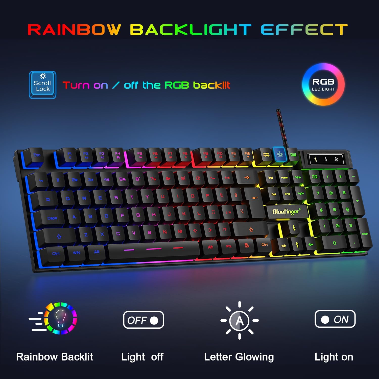 【Backlit Gaming Keyboard】: Rainbow backlit keyboard, you can easy turn ON/OFF by pressing “Scroll Lock” key, the Rainbow Backlight can illuminate the letters through the keys, which make it easier for You to type in a dark room. The double-shot injection moulding process ensures that letters never fade and have good light transmission.