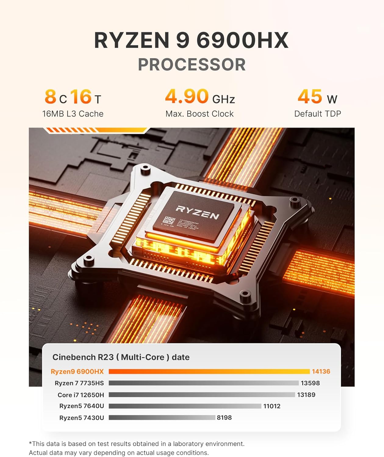 Unleash Power with AMD R9 6900HX: BOSGAME P6 Mini PC powered with the AMD Ryzen 9 6900HX (8C/16T, 4.9GHz) and Radeon 680M (RDNA 2) – delivering 120+ FPS in Fortnite/COD at 1080p Ultra. Experience 40% cooler temps vs. traditional PCs thanks to advanced vapor chamber cooling. Perfect for esports pros and 4K indie gamers alike