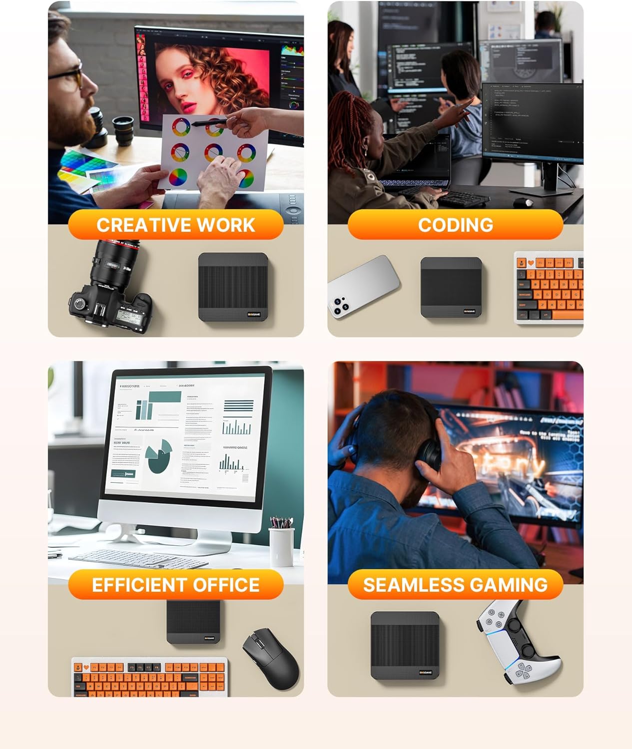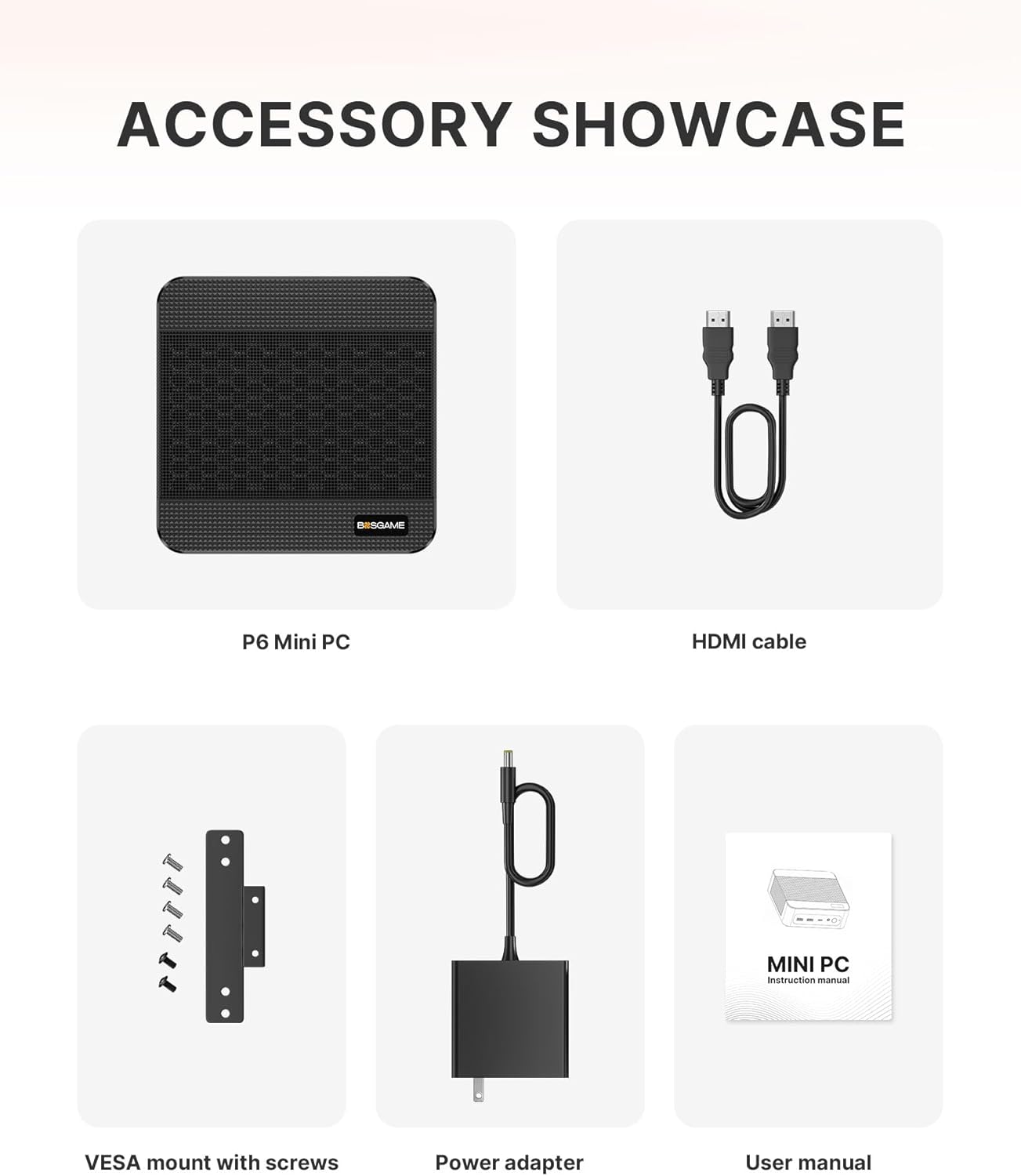 Blazing Fast 32GB LPDDR5X & 1TB PCIe 4.0 SSD: The P6 decent Mini Gaming PC dominates with 32GB of ultra-fast LPDDR5X RAM (6400MHz) and 1TB NVMe PCIe 4.0 SSD—expandable to a massive 8TB across dual slots. For open games and large files almost instantly. Perfect as Your main home computer,a space-saving workstation, a living room gaming/media hub