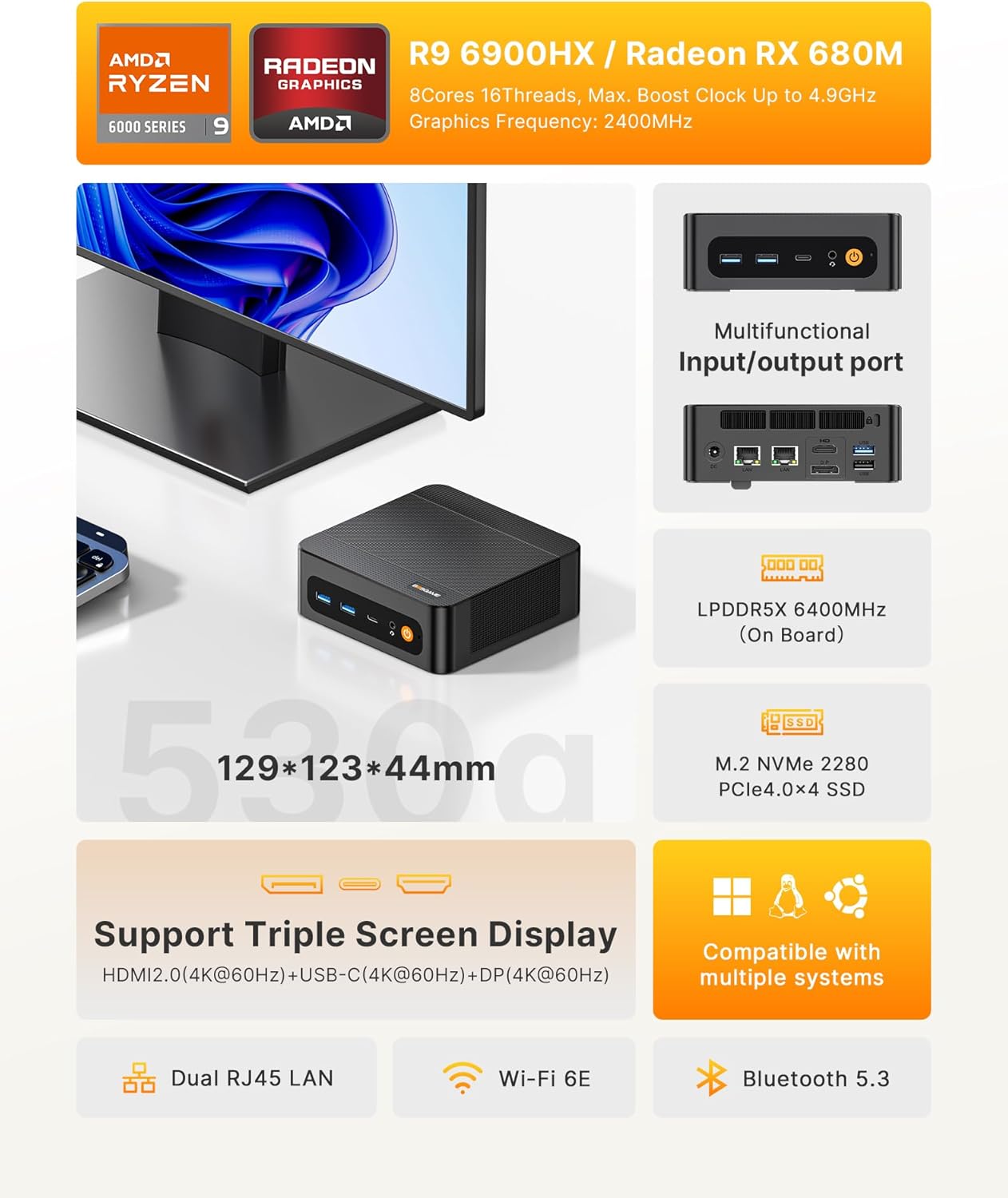 BOSGAME P6 Gaming Mini PC w/AMD Ryzen 9 6900HX | 32GB DDR5 RAM | 1TB PCIe 4.0 NVMe SSD | Dual Gigabit Ethernet | Triple Display (HDMI/DP/USB-C) | AX210 Wi-Fi 6E | BT 5.3 | Compact Desktop Computer