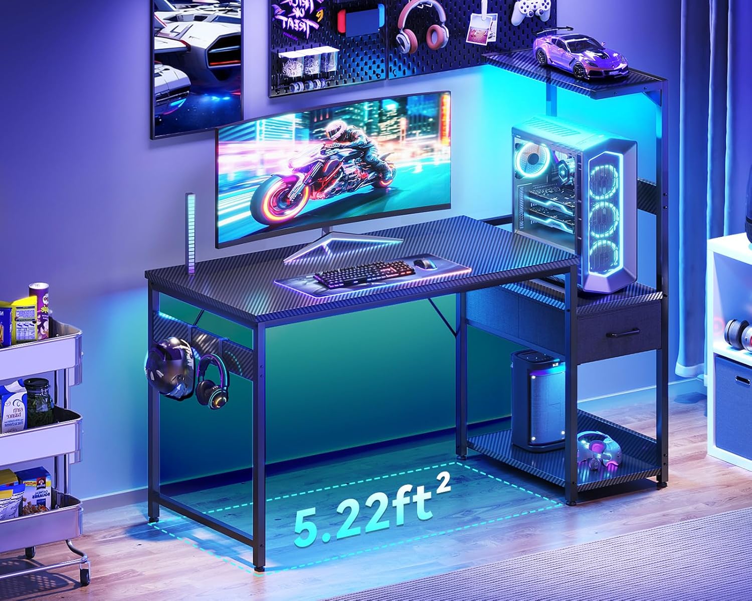 Casaottima 48 Inch Gaming Desk with Storage & LED Lights, Reversible Computer Desk with Display Shelves & Fabric Drawer, Modern Gamer Desk Table with Side Headphone Hook, Carbon Fiber Black