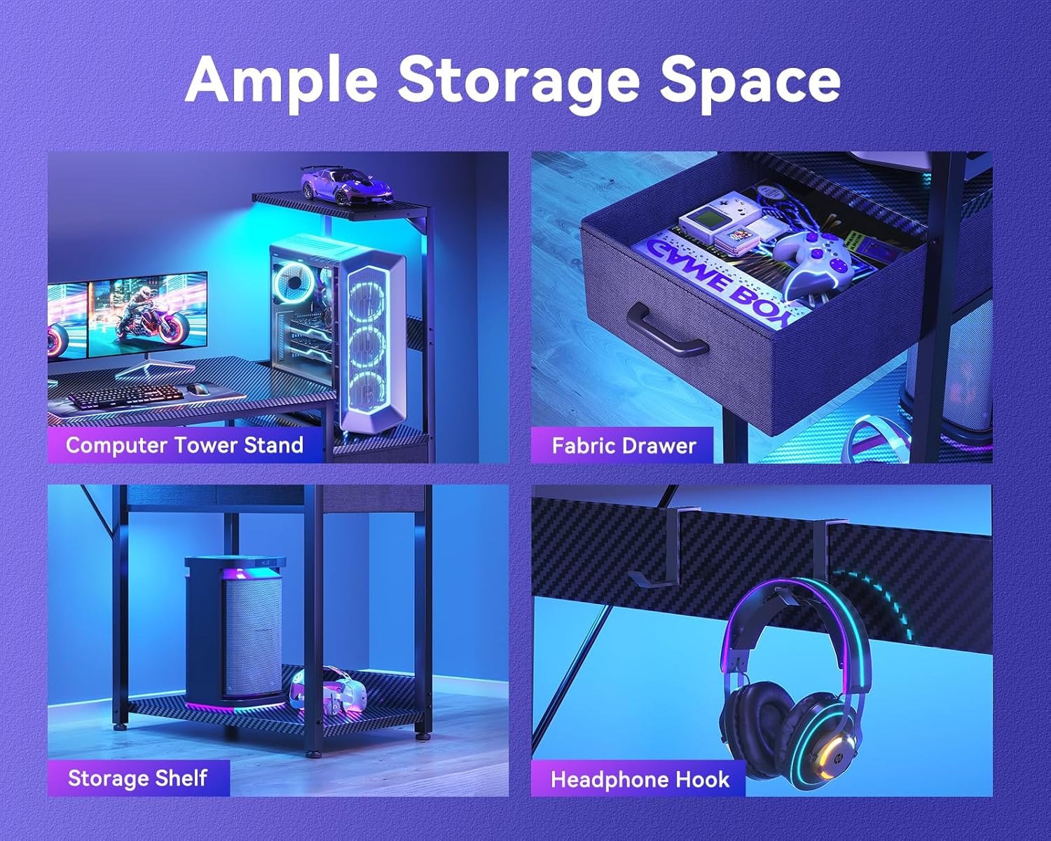 STORAGE SOLUTIONS: Multiple storage features including fabric drawer, elevated tower platform for your gaming pc case, bottom storage shelf, and convenient headphone hooks for gaming accessories, keeping the desktop neat and tidy.