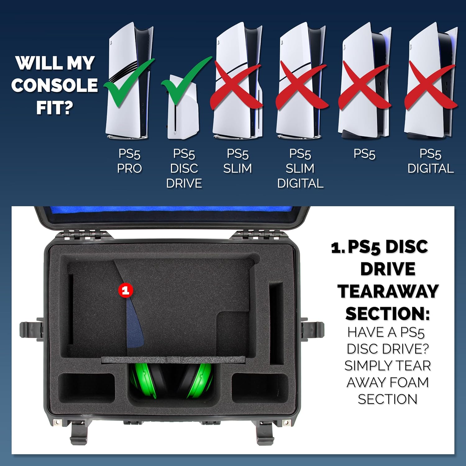 CASEMATIX Travel Case Compatible With PlayStation 5 Pro & PS5 Pro Disc Drive – Hard Shell Waterproof Case with Custom Foam for Console, Pro Controllers, Stand, Headset, Games and Accessories
