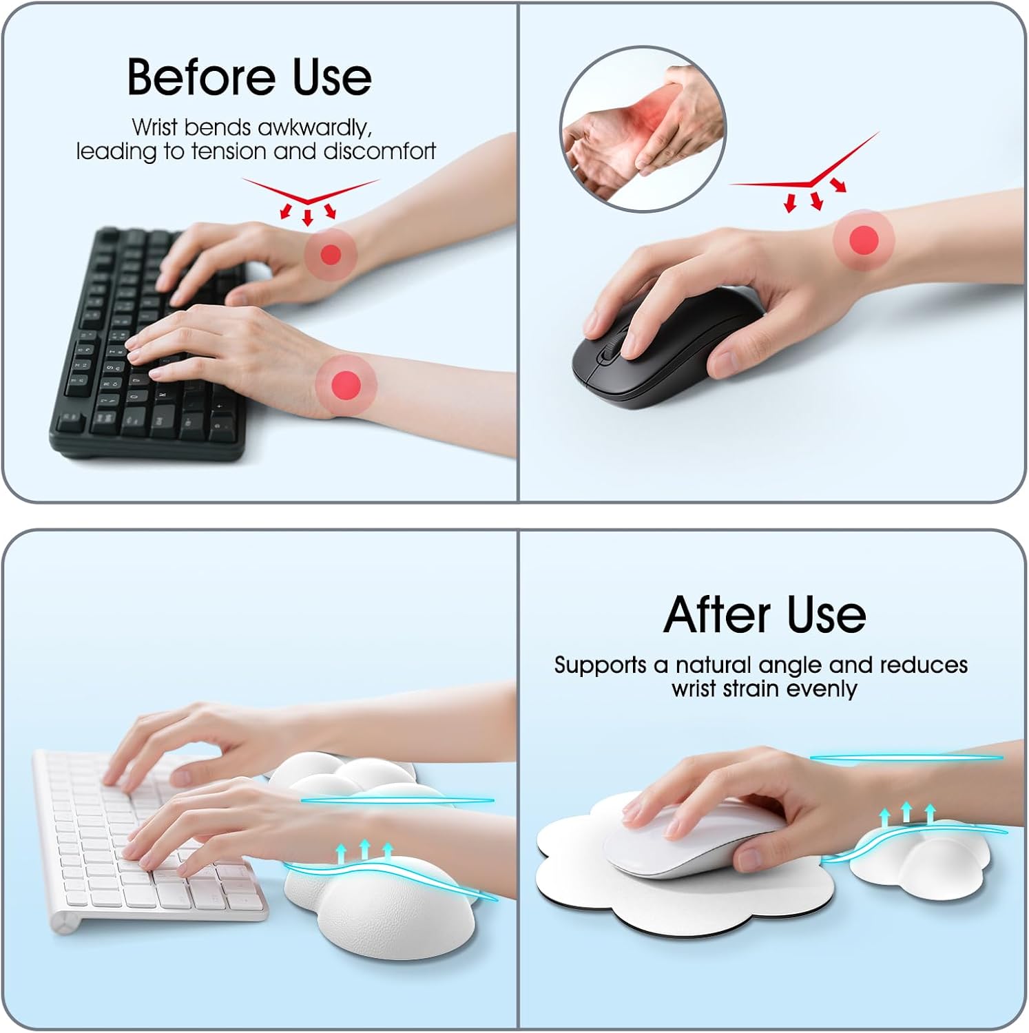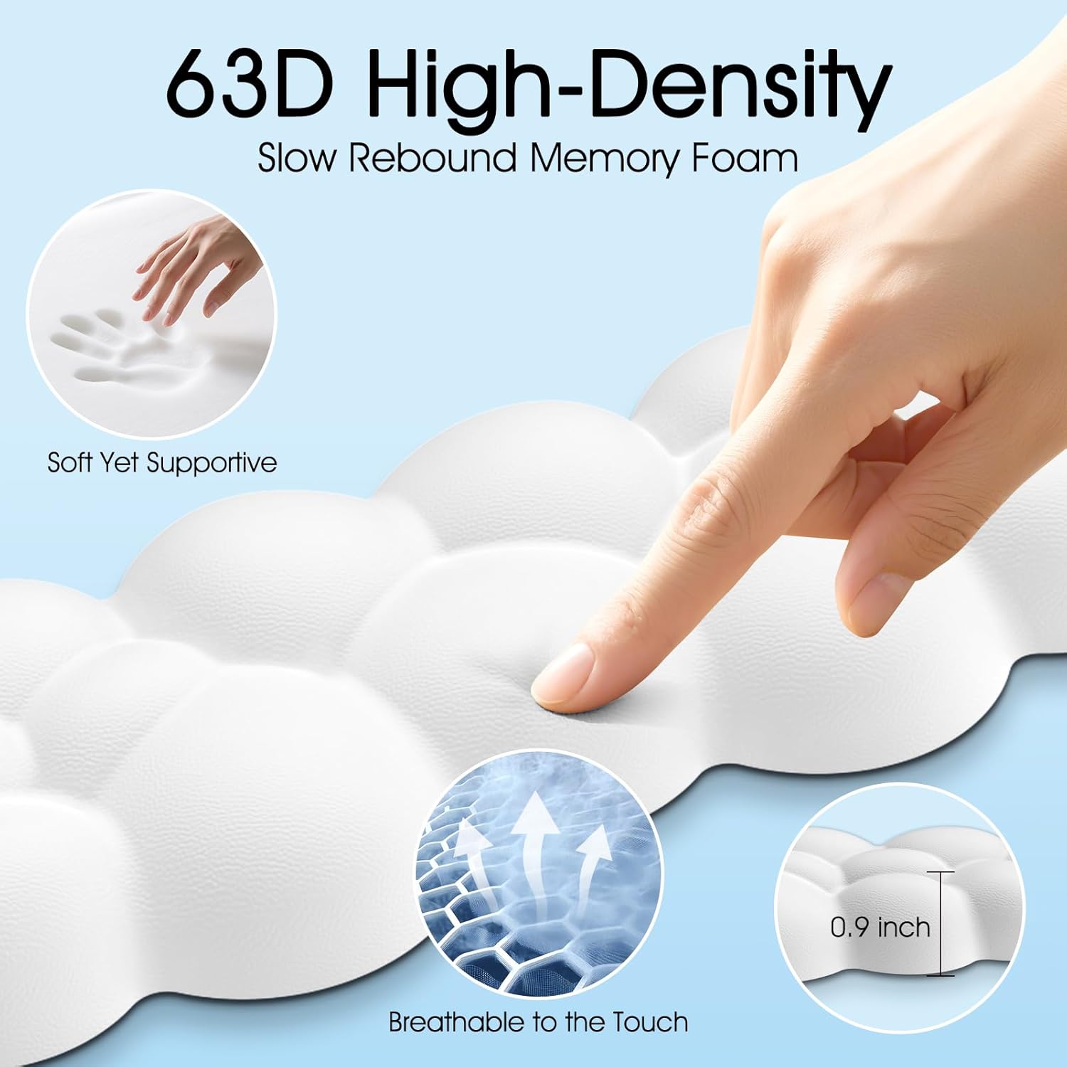 Cloud-Inspired Shape & Airy Texture: This keyboard cushion is styled with a soft cloud contour that naturally fits the wrist curve, encouraging a comfortable and balanced position while easing unwanted strain. Acting as a cloud hand rest, its textured surface allows air to circulate smoothly, keeping your wrist refreshing and supported through long hours of typing or gaming