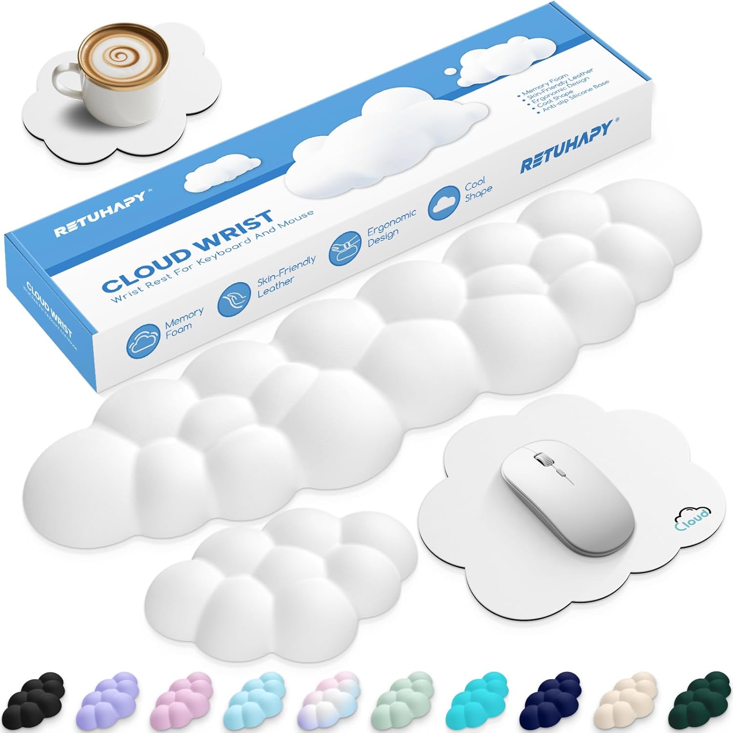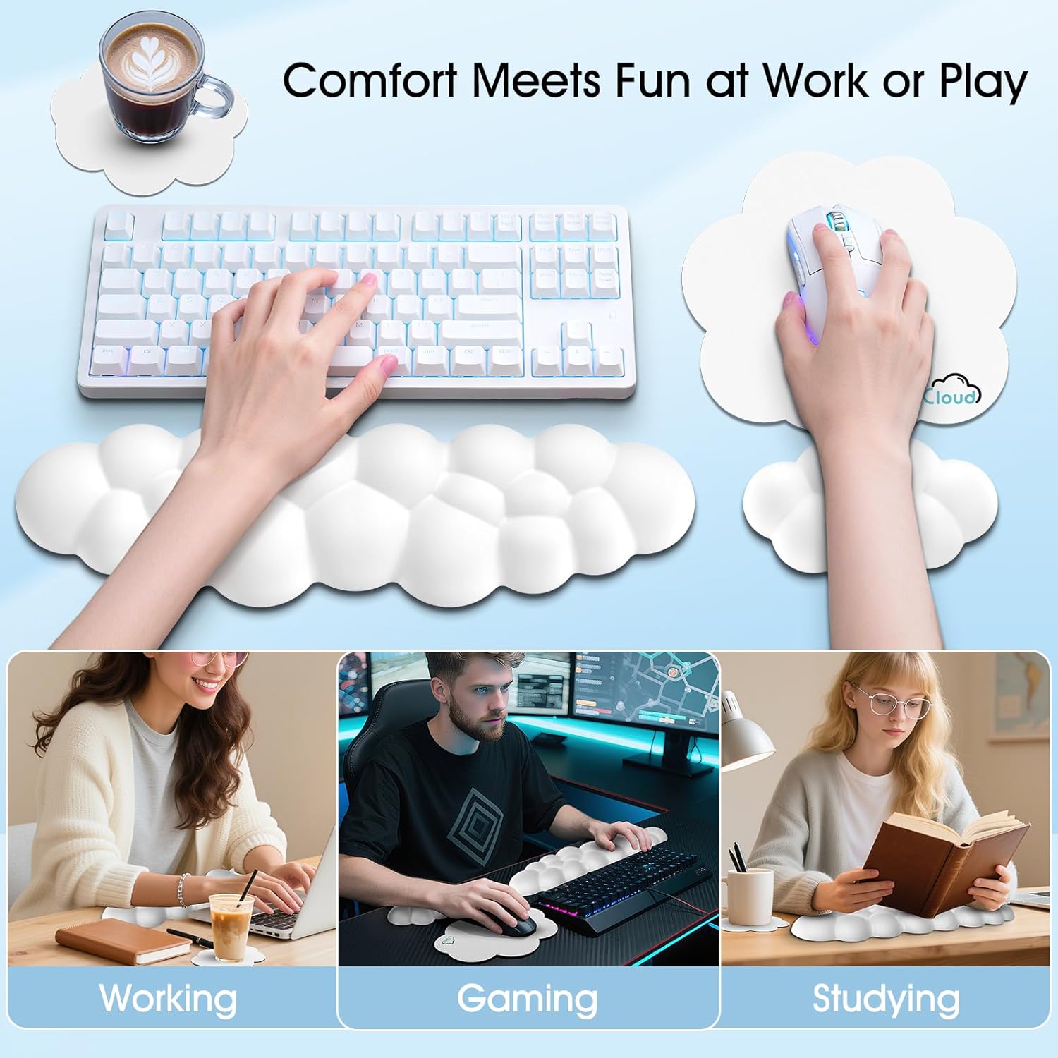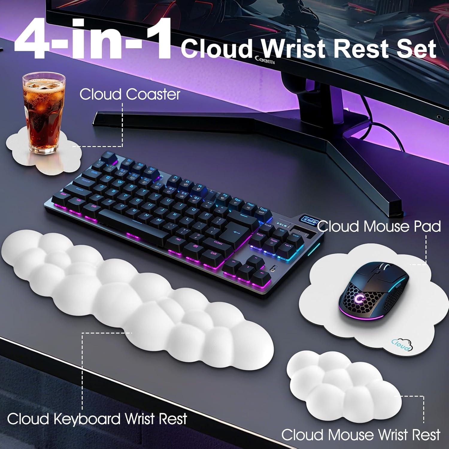4-in-1 Cute Desk Accessory Set: This adorable set includes a cloud keyboard wrist rest, cloud mouse wrist rest, cloud mouse pad, and a charming cloud coaster. The wrist rests provide cozy support for your hands, while the entire set adds a fun, playful touch to your desk, coming in a delightful gift box suitable for brightening up gaming setups, home offices, or surprising women or girlfriend with a aesthetic present