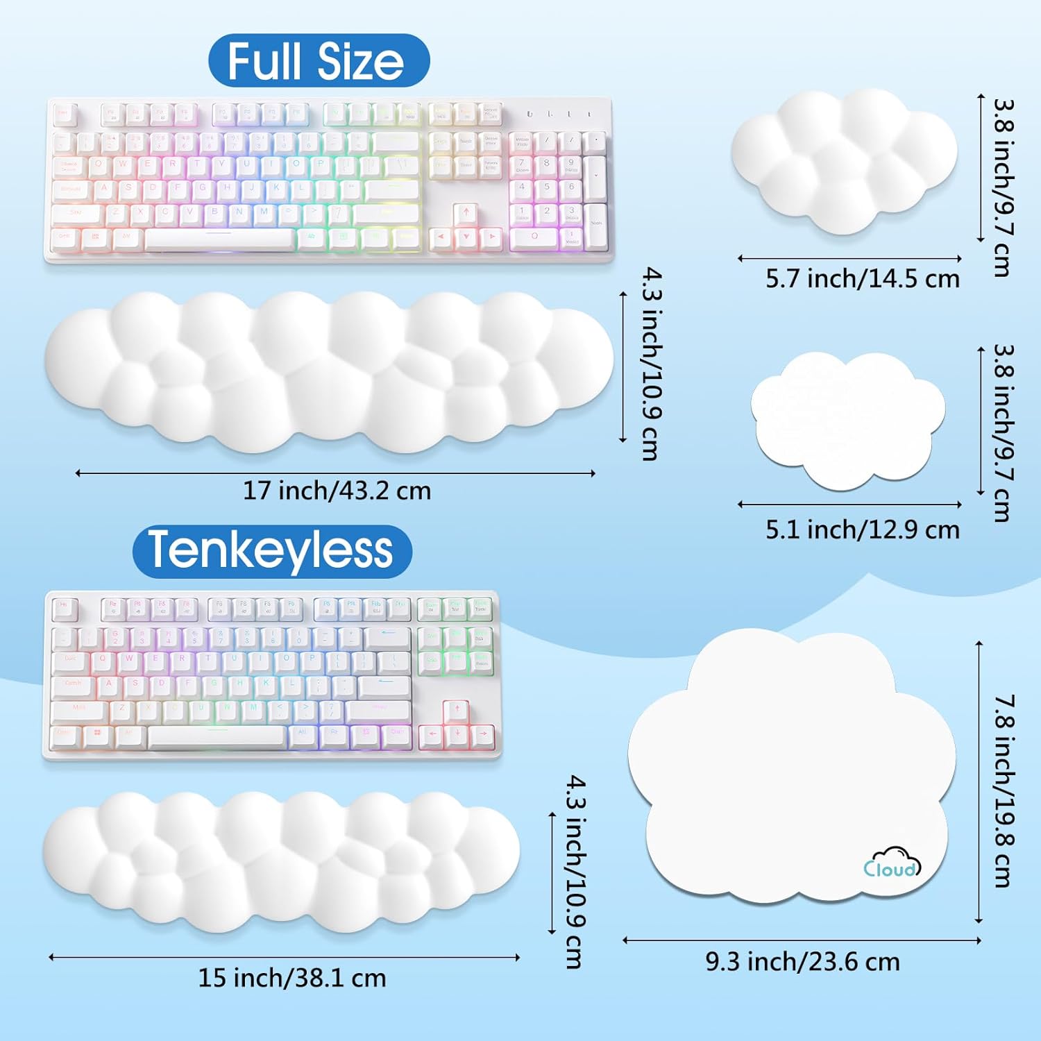 Cloud Wrist Rest Keyboard Cushion, 4-in-1 Ergonomic Cloud Keyboard Wrist Rest and Mouse Pad Set with Memory Foam Arm Support for Palm, Cute Desk Accessory for PC Gaming Setup, White