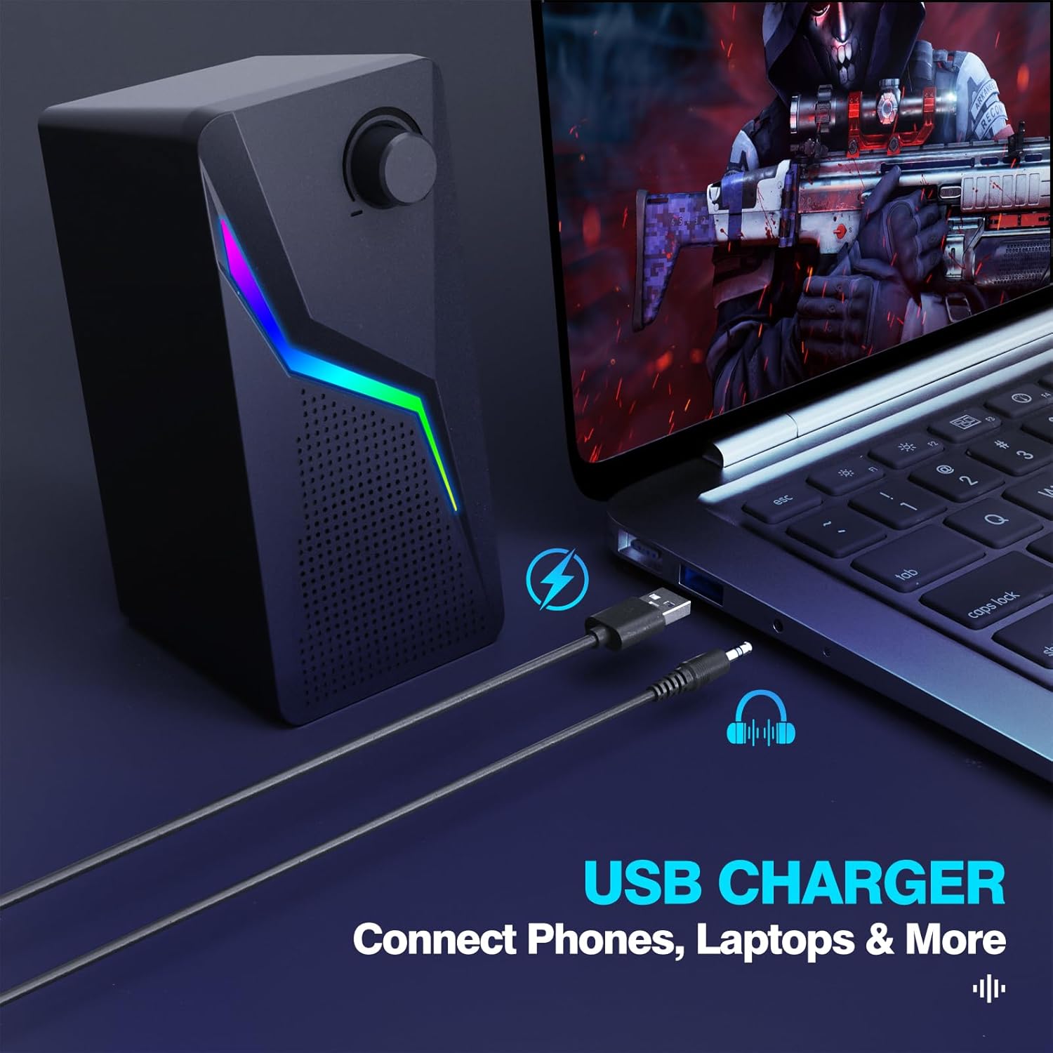 Plug & Play PC Speakers – Works Instantly with Any Device: These USB powered PC speakers for computer connect in seconds via 3.5mm audio jack or USB port. Compatible with Windows, Mac, Linux, PS5, and smartphones – no drivers needed! Ideal for home office, gaming, and online classes.