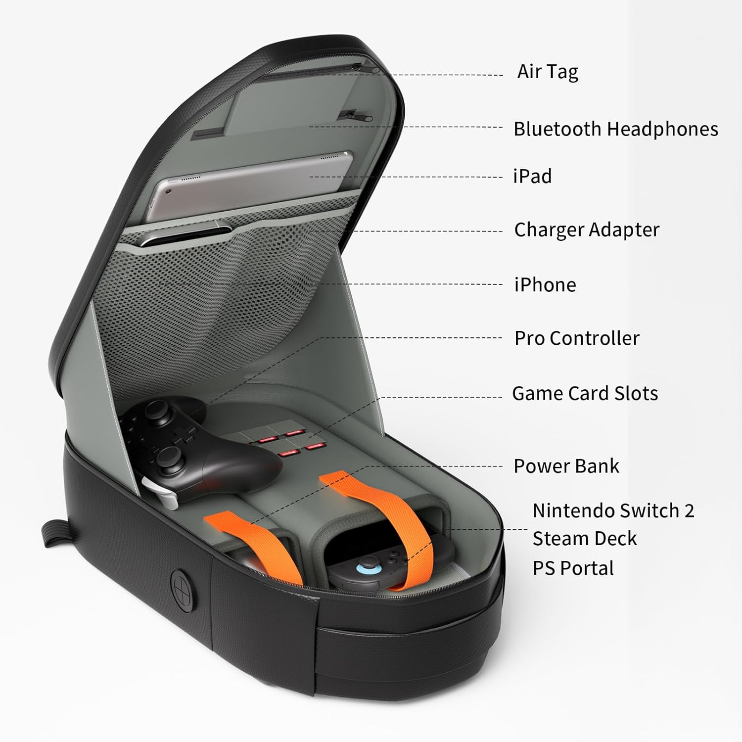 Serious Storage: This switch 2 bag is purpose-built for Nintendo Switch 2 /PlayStation Portal players who take their gaming everywhere. With roomy compartments, it fits your Nintendo Switch 2, Pro Controller, AirTag, 8 game card slots, iPad Air 11-inch, earphones, power bank, and even your sunscreen shirt. Please note: Only suitable for tablets under 11 inches