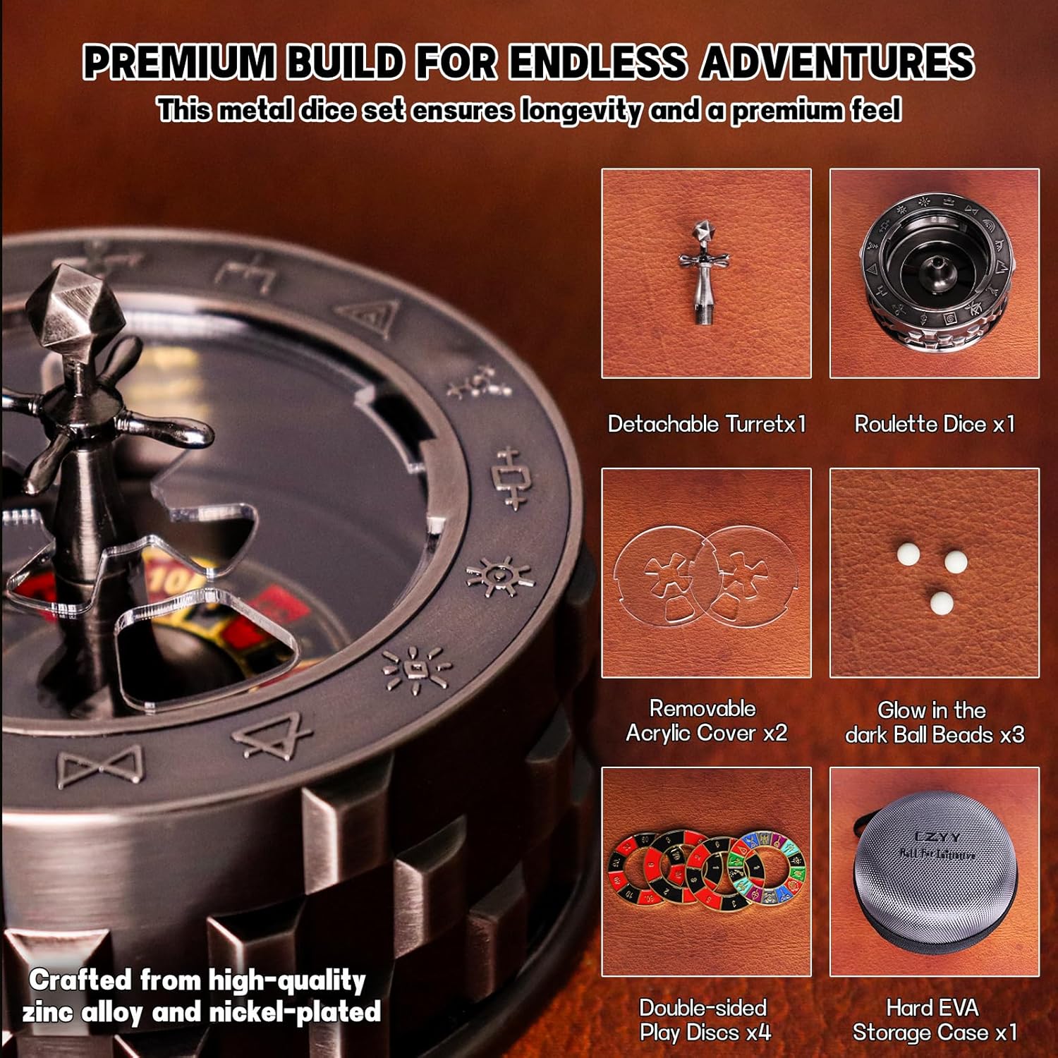 PREMIUM BUILD FOR ENDLESS ADVENTURES – Crafted from high-quality zinc alloy and nickel-plated, this metal dice set ensures longevity and a premium feel. The spin dice are built to withstand countless gaming sessions, providing you with a durable and luxurious accessory.