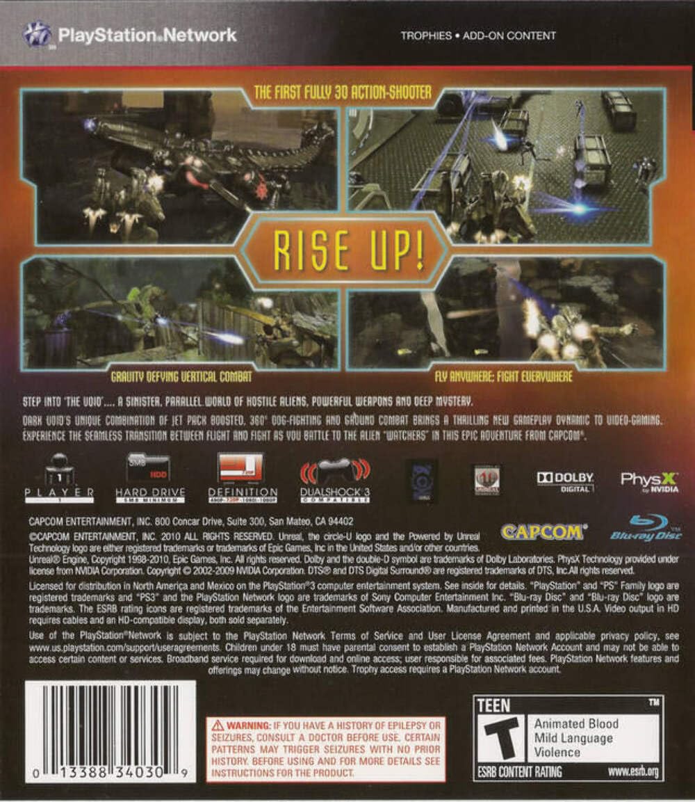 Dark Void is a sci-fi action-adventure game that combines an adrenaline-fuelled blend of aerial and ground-pounding combat. Set in a parallel universe called The Void, players take on the role of Will, a pilot dropped into incredible circumstances within the mysterious Void. This unlikely hero soon finds himself swept into a desperate struggle for survival, joining forces with a rebel human group called The Survivors. Trapped in the Void, these resistance fighters are battling to hold off a mysterious alien race that plans to threaten Earth. Dark Voids unique combination of jetpack-booster aerial dog fighting and third-person combat creates a thrilling new gameplay dynamic to the third-person shooter experience. Taking 3D action to a whole new level, Dark Voids unique vertical combat system allows players to dangle from thousand foot drops as they take cover and hurl enemies to their doom, bringing a whole new sense of tension and thrill to the player. Will is also equipped with a powerful rocket pack which allows for fierce in-air combat, hurtling through the Void at blistering speeds while shooting down anything that gets in his path. Features Sci-Fi action/adventure combines aerial and on-foot combat for a totally unique third-person shooter experience Wills jetpack delivers total freedom of movement allowing players to race against UFOs in high-speed chases and rain death from above onto unsuspecting otherworldly foes Speed and scale unmatched by any other action title: send Will zipping through tight corridors and then out into immense canyons and futuristic geoscapes Gravity-defying vertical combat system, where moving up is the only way to bring your enemies down Seemless transition between jetpack flight, ship-to-ship dog fighting and third-person shoot-em-up action all exists within the same level not broken up into different areas Unique grip system that allows the players to scale walls by jumping from surface to surface and hijack UFOs while in mid-air Huge bosses that require fast reflexes and aerial barnstorming maneuvers to defeat Developed by Airtight Studios, a new group featuring team members from the Crimson Skies series of video games