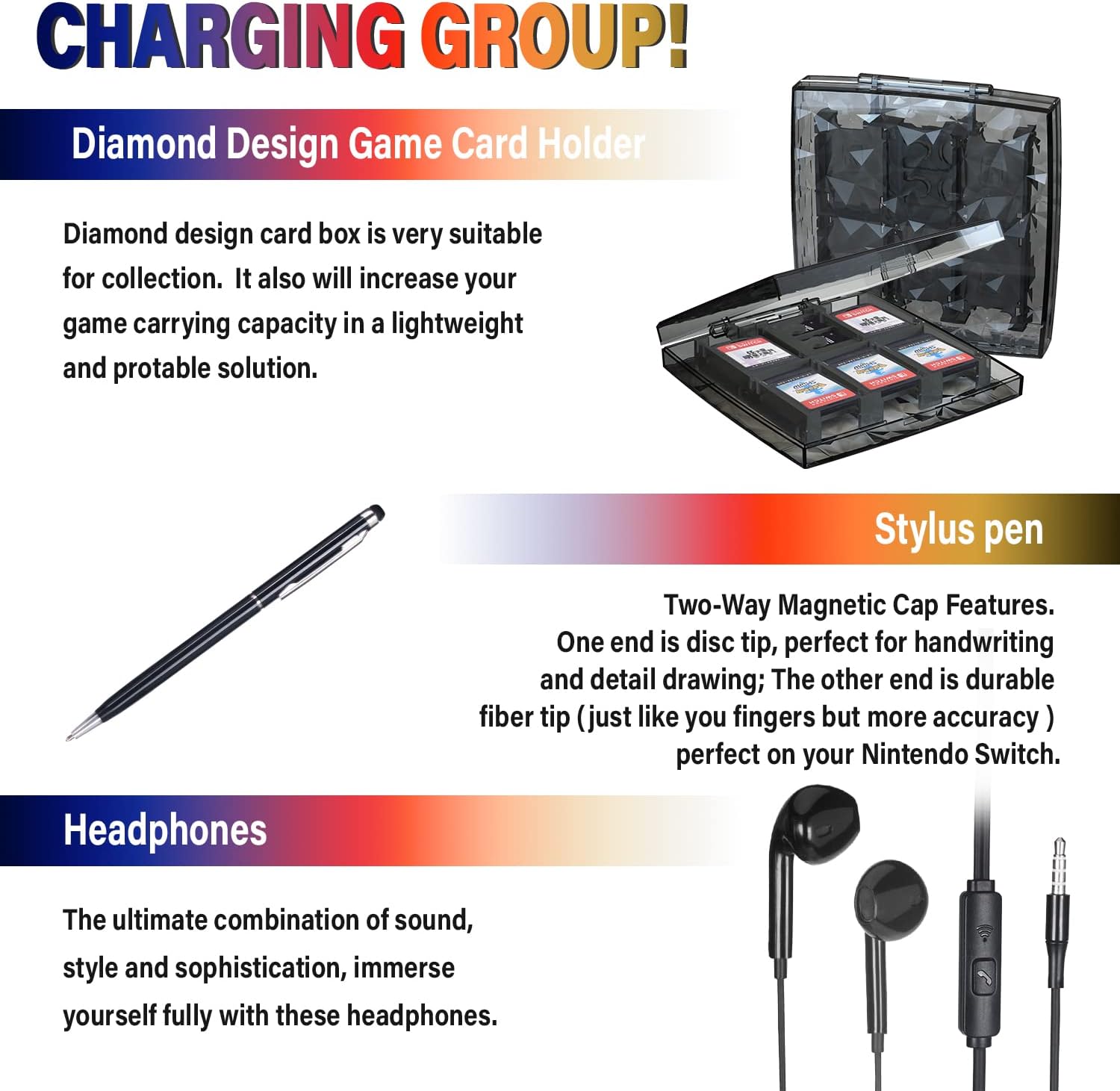 Switch Bundle Kit CONTAINS: 1x Carrying Case (Fit Nintendo switch Charger), 1x Compact Game Cartridge Case (for up to 8 games), 1x Protective Comfort Case, 1x Compact Playstand, 1x Tempered Glass Screen Protector, 4x Joystick Caps, 1x 4 Channel Charging Dock, 2x Switch Joy-Con Wheel, 2x Switch Joy-Con Grip, 4x Joy-Con Sillicone case