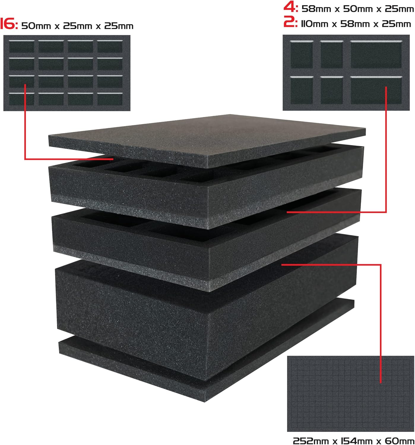 MINIS BARRACKS – House your collection of PCs, NPCs, monsters across 3 integrated miniatures foam trays: 16-slot tray for 28mm figures, 8-slot tray for medium figures, and a customizable foam tray