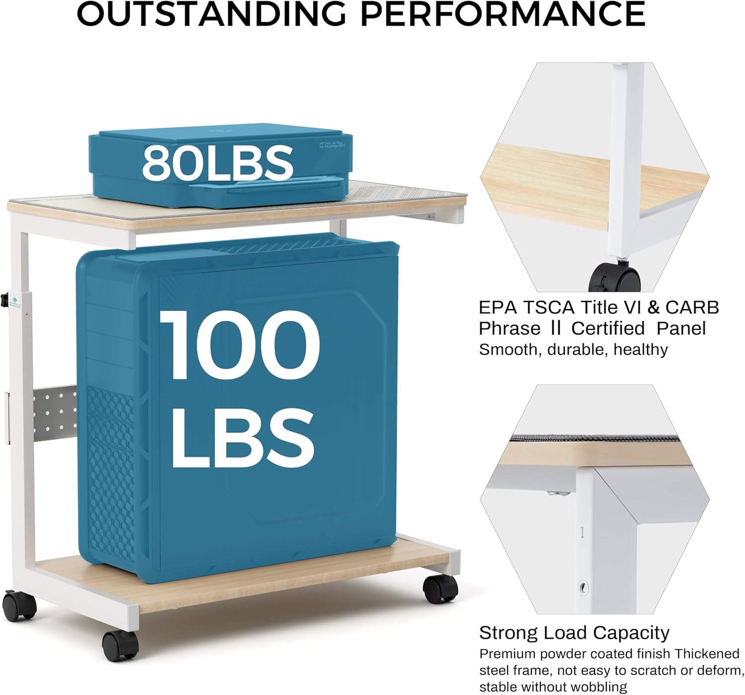 Sturdy Structure: EPA TSCA Title VI & CARB Phrase Ⅱ Certified desktop panel with premium anti-scratch finish. Thickened steel frame with powder-coated finish resists corruption to ensure stability and durability, not easy to scratch or deform, no wobbling. The bottom shelf max weight up to 100LBS, top shelf is 80 LBS. NOTE: When moving, the computer tower stand can only supports up to 80 LBS