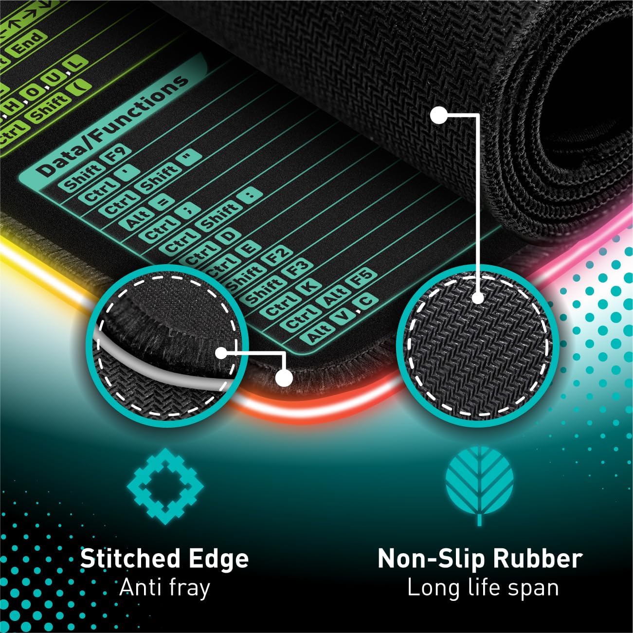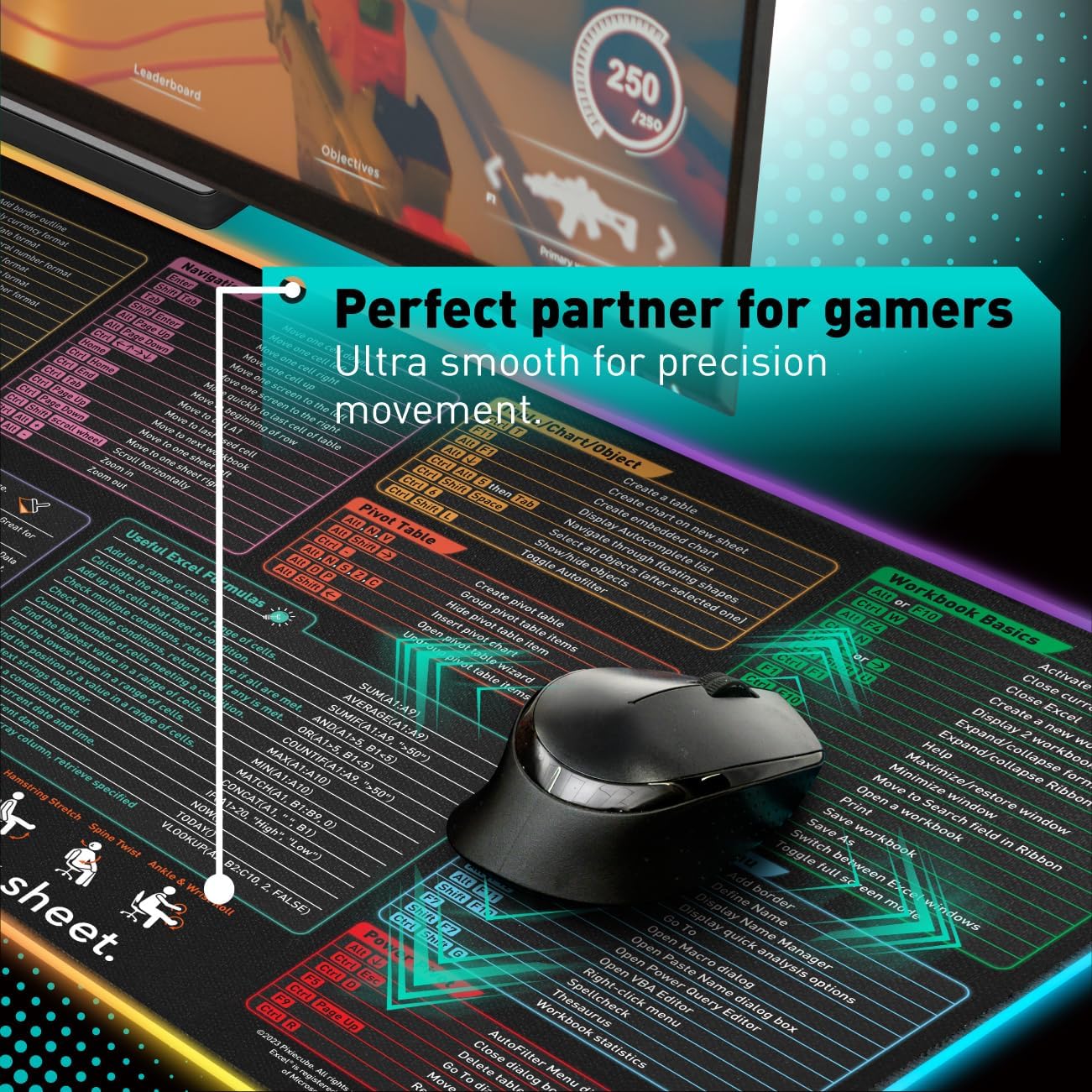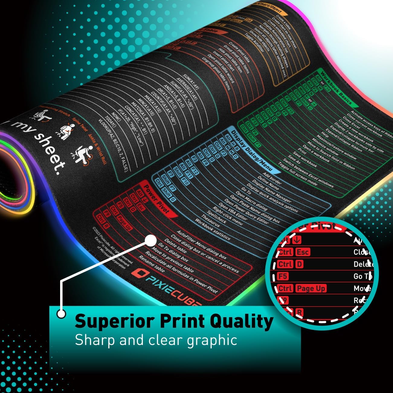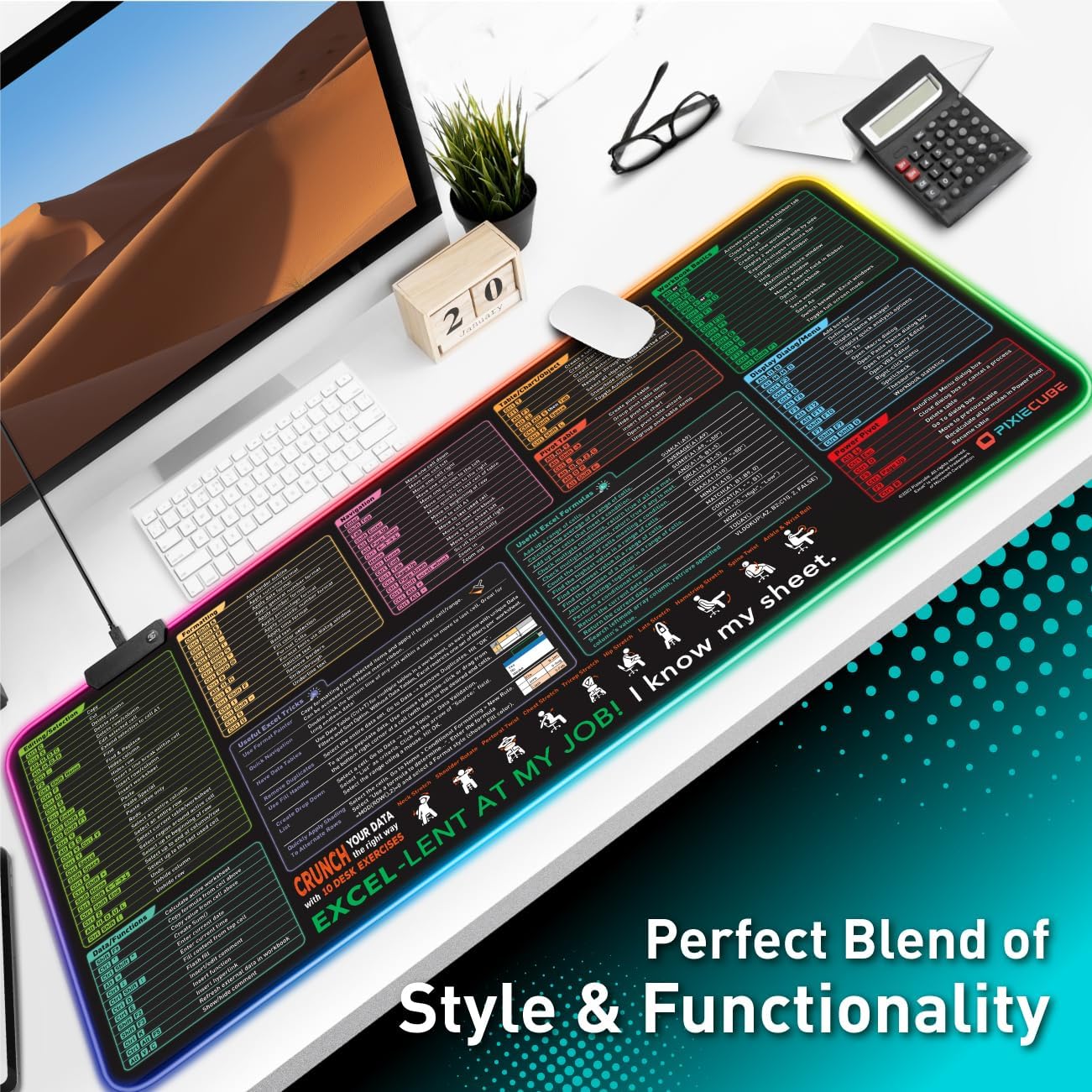 Excel Shortcut Keys LED Mouse Pad – Colorful RGB Luminous Extended Large Cheat Sheet Gaming Mousepad| PC Office Spreadsheet Keyboard Mat| Non-Slip Stitched Edge