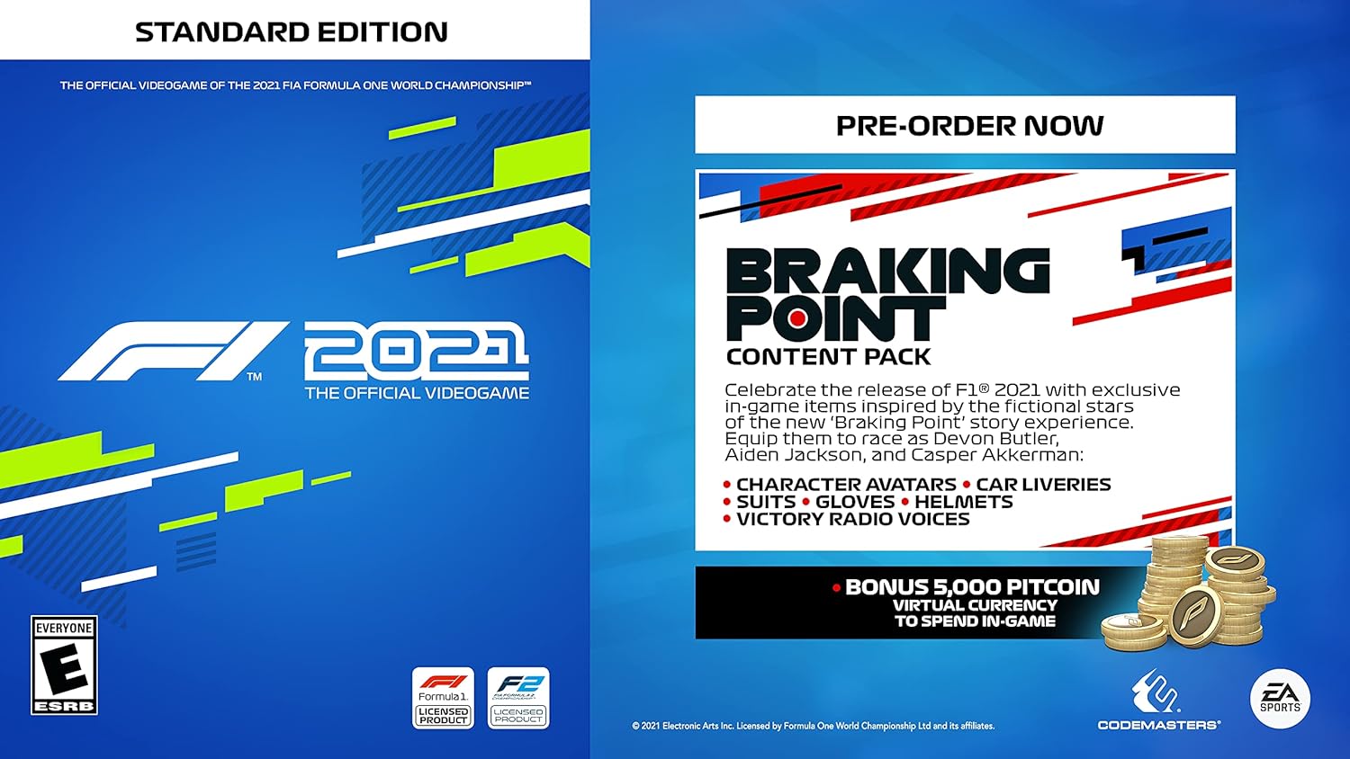 Every story has a beginning in F1 2021, the official videogame of the 2021 FIA Formula One world Championship. Enjoy the stunning new features of F1 2021, including the thrilling story experience ‘braking point’, two-player career, and get even closer to the grid with ‘real-season start’. Take your team to the top in the acclaimed ten-year ‘My team’ Career mode, or race head-to-head in split-screen and multiplayer. Immerse yourself in the greatest racing spectacle on the planet and race with the authentic lineup of twenty heroic drivers and ten iconic teams from the 2021 Season: ‘braking point’ – the thrilling new story experience, new ways to play: two-player career and ‘real-season start’, acclaimed ‘My team’, split-screen and multiplayer.