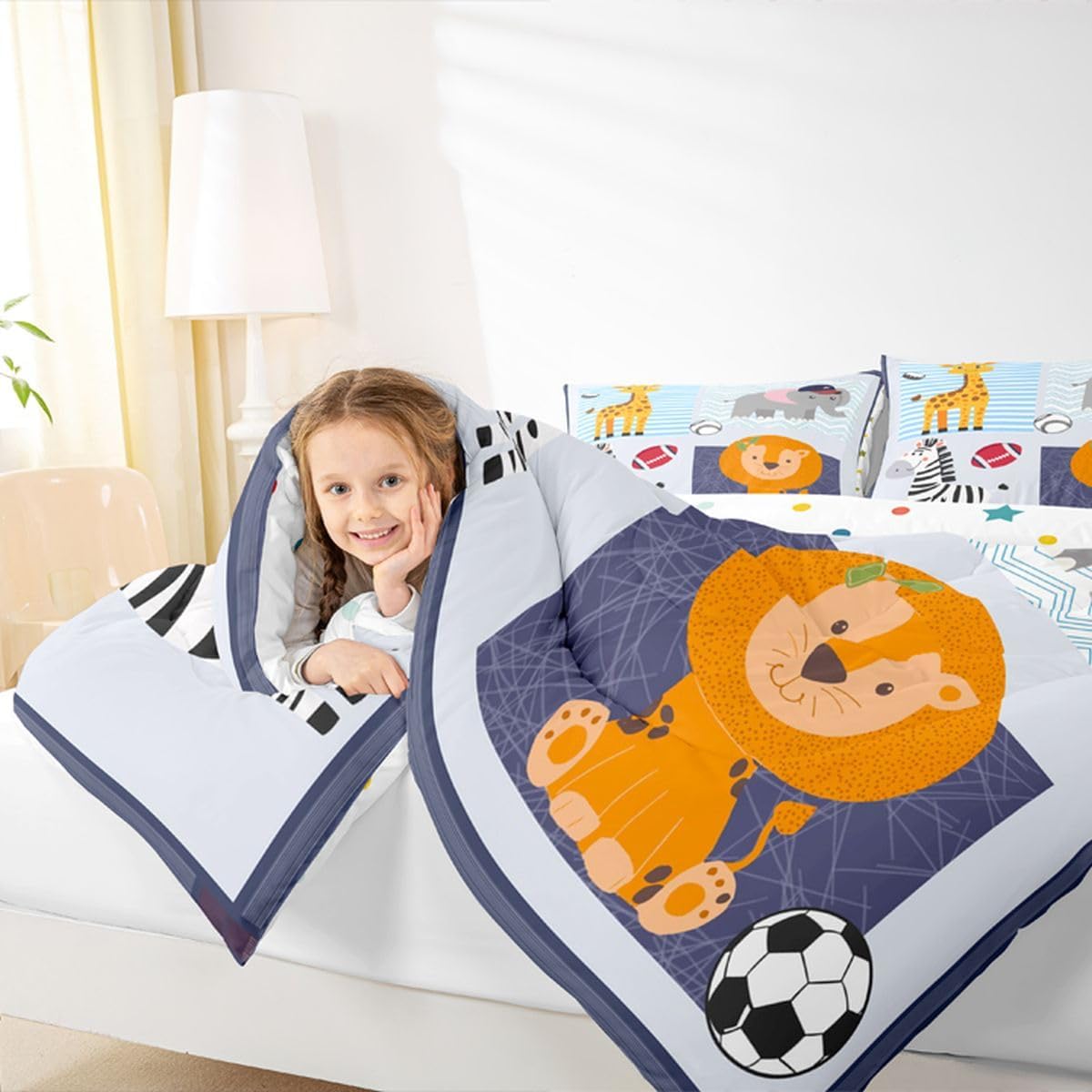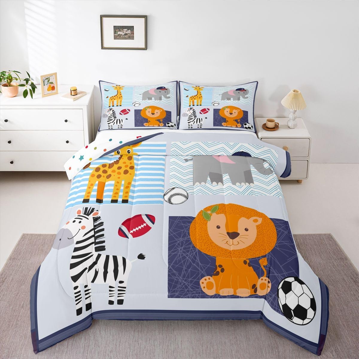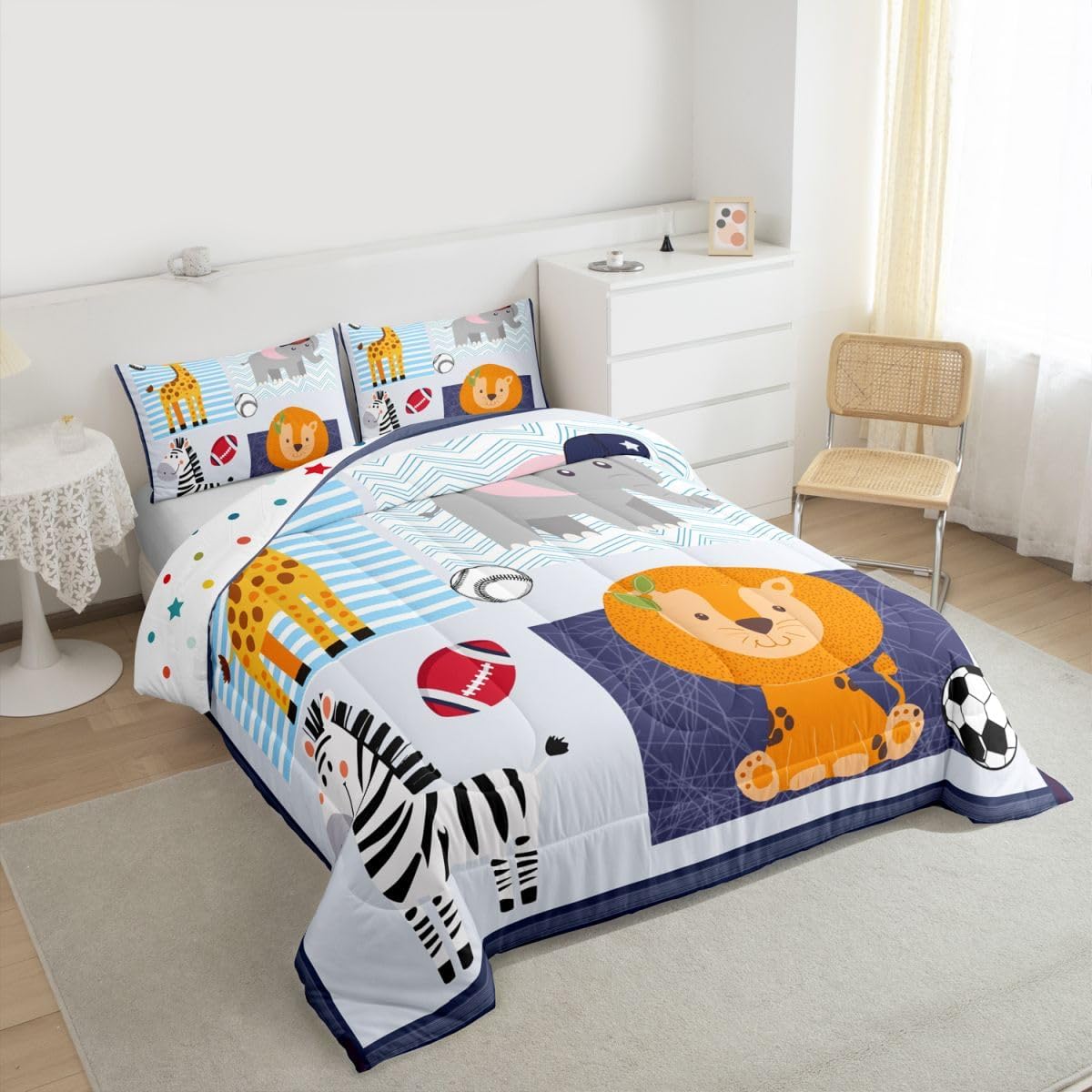 Feelyou Cute Animal Nursery Bedding Set Soft for Boys Girls, Cartoon Lion Giraffe Comforter Set King Size Zoo Animal Duvet Quilt Wildlife Ball Game Bedroom Decor 3 Pcs with 2 Pillow Cases
