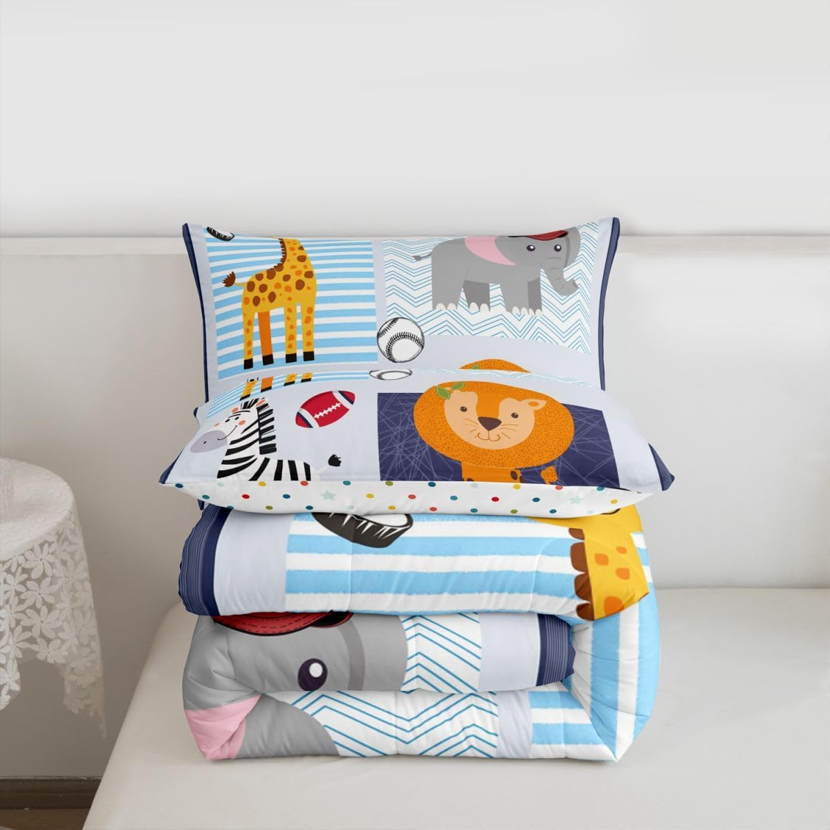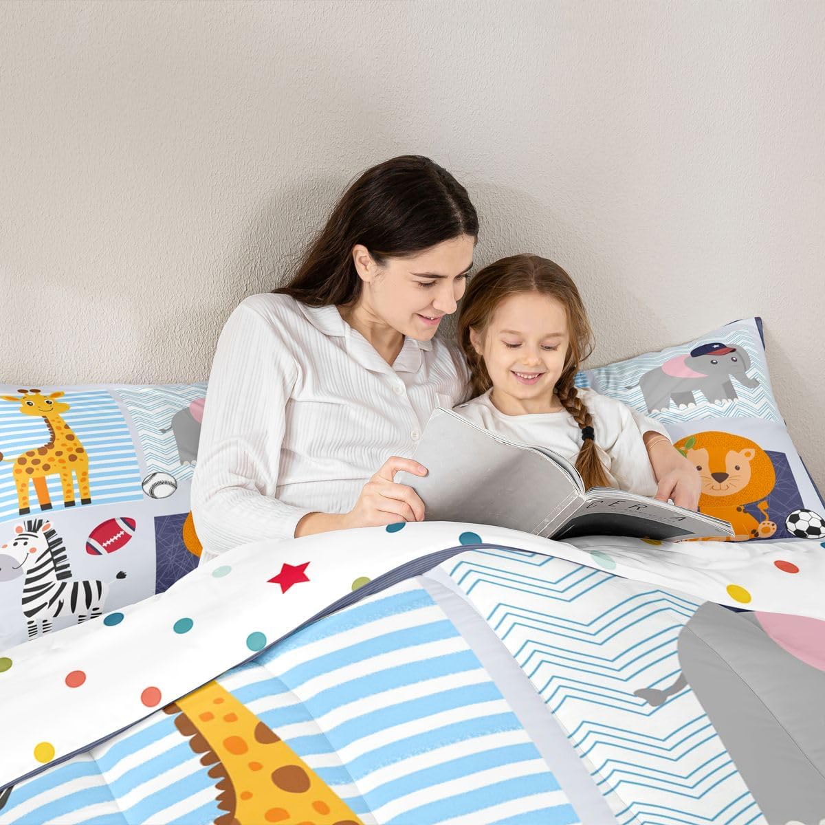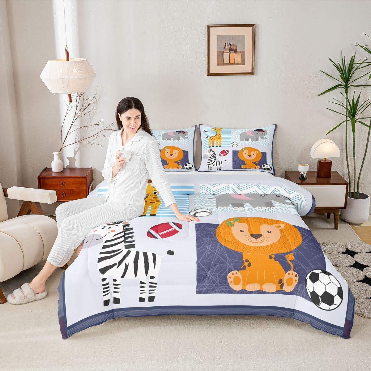 Feelyou Cute Animal Nursery Bedding Set Soft for Boys Girls, Cartoon Lion Giraffe Comforter Set King Size Zoo Animal Duvet Quilt Wildlife Ball Game Bedroom Decor 3 Pcs with 2 Pillow Cases