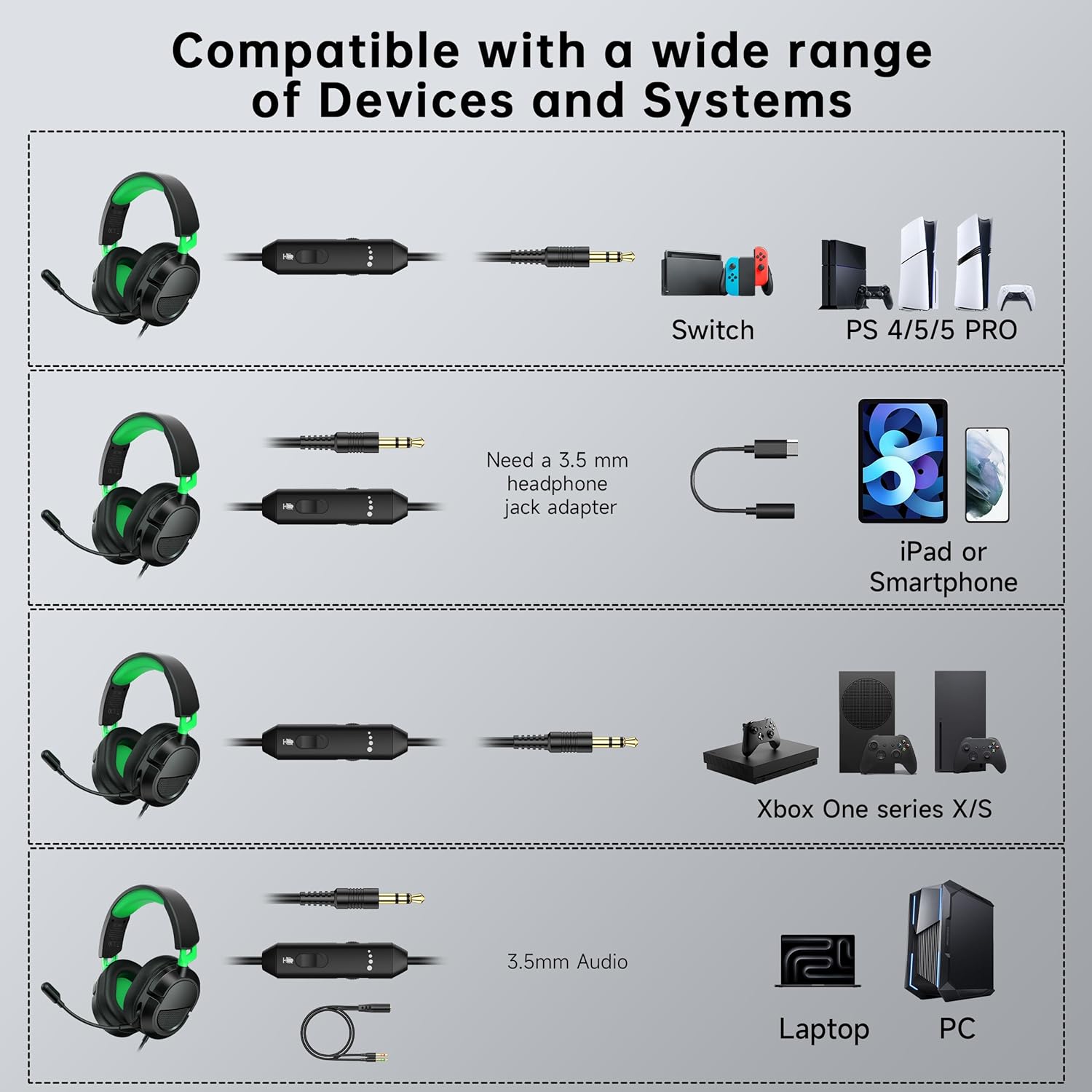 《Strong Compatibility》:Gaming headset with mic compatible Xbox series X, Xbox series S, Xbox One, PS5, PS5 pro, PS4, Switch, PC, Mac, Windows, Laptop, Smartphones, Steam Deck, Rog Ally, Tablet and more.