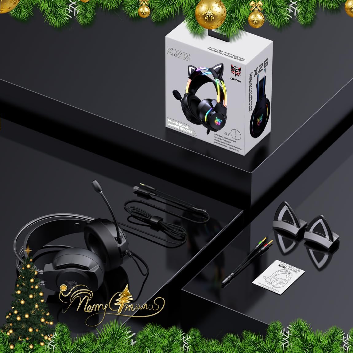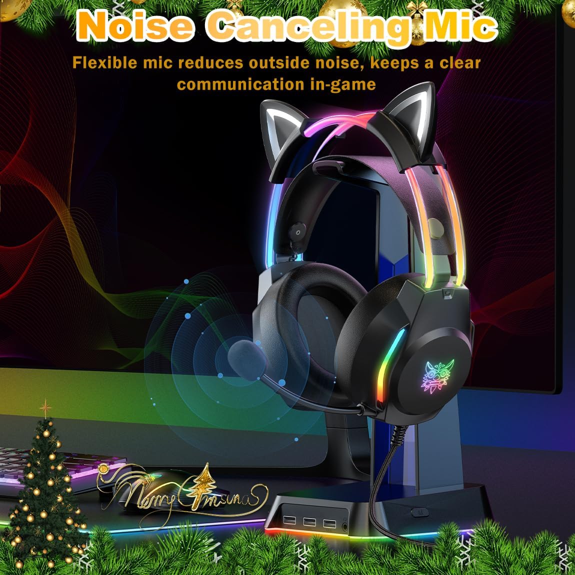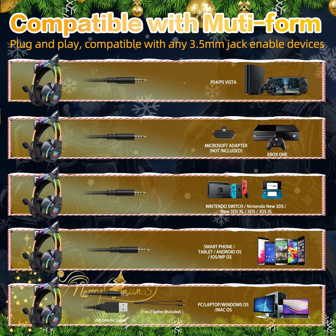 【Multi-Platform Compatible】ONITOON Gaming Headset with Microphone is compatible with PC, PS4, PS5, Xbox(adapter needed), Nintendo Switch, desktop, laptop, tablet, iOS devices, cell phone, 3.5mm jack support devices. Versatile to meet all your needs for gaming. *Note: Connecting to Switch series consoles, the mic is not compatible. The cat ears headphone not work on the XBOX 360