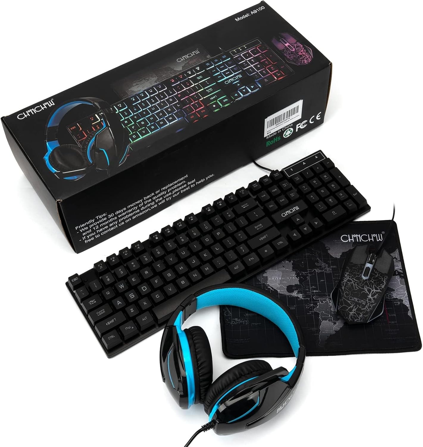 Gaming LED Keyboard Mouse Headset and Mousepad Bundle, CHONCHOW Wired Rainbow LED Light Up Gaming Keyboard Mouse Headset, Value 4 in 1 Game Set for Xbox PS4 PS5 PC Laptop Gamer