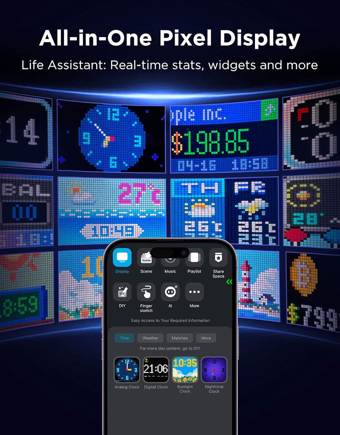 Rich Pixel Art & Live Updates: Stay in the game with real-time updates for time, weather, stocks, and NBA/NFL scores! Explore 150+ preset scenes and 4 PAC-MAN-inspired visuals.