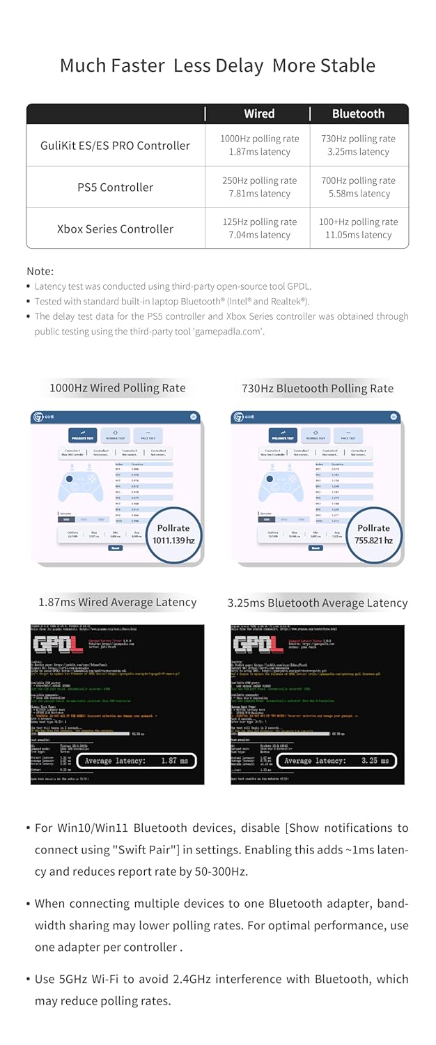 WORLD FASTEST WIRELESS SPEED:GuliKit Hyperlink 2 wireless tech delivers ultra-low latency—3.25ms (730Hz) Bluetooth on PC and 1.87ms (1000Hz) wired—offering world-class speed and e-sports-level responsiveness on PC,Switch & Android.