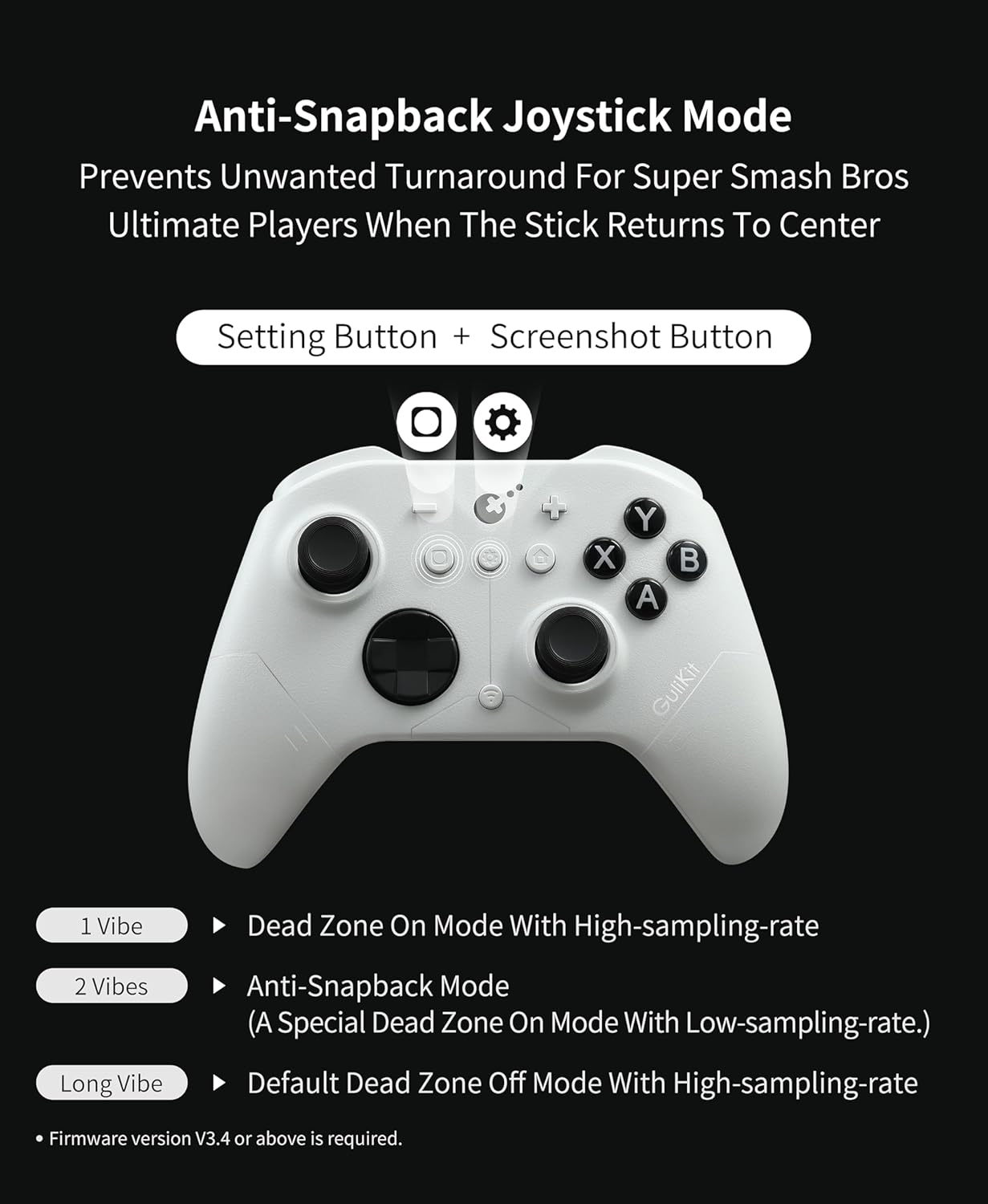 NOW FEATURING ANTI-SNAPBACK JOYSTICKS MODE: Prevents unwanted turnaround for Super Smash Bros. Ultimate players when the stick returns to center. How to activate: Press the HOME button and the Screenshot button simultaneously. When the controller vibrates twice, it enters Anti-Snapback Mode.