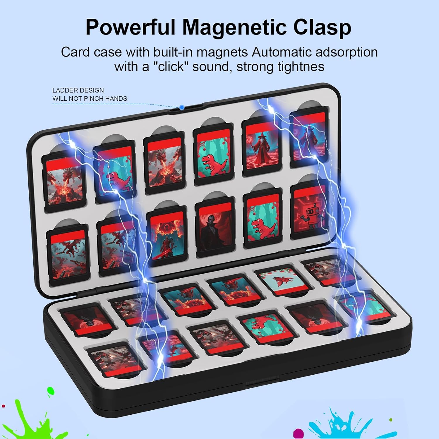 【Magnetic Closure& Reinforcement Hinge】This Switch game holder has an automatic magnetic lock design, makes it easy to open and re-lock it. Reinforcement hinge ensure games stay securely in place,won’t have to worry about the case accidentally opening and losing switch game card.