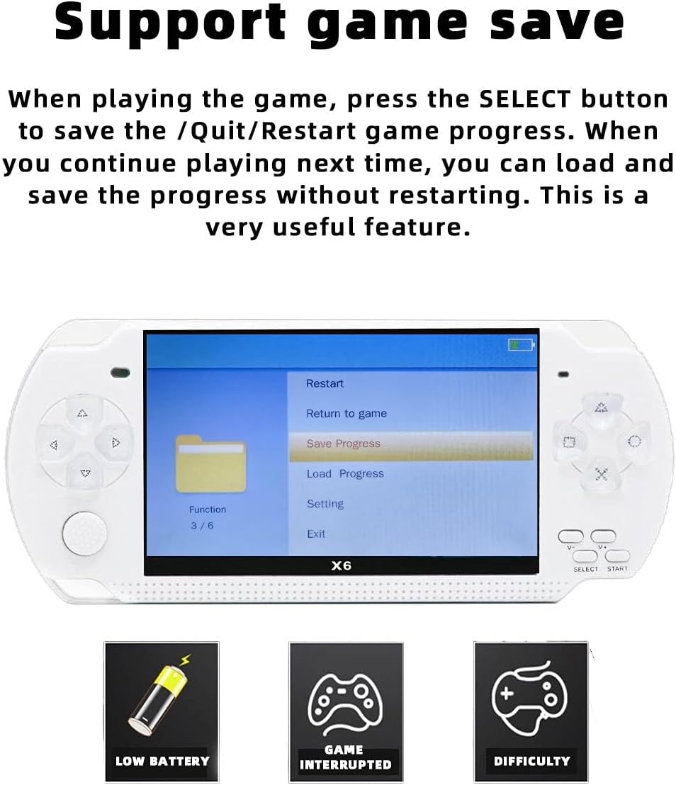 Support game archive.When you play the game, what should the user do if there is a situation such as low power/something to leave/the game is too difficult to pass/ etc?you can press the “SELECT” button to Save /Exit/Restart game progress. When you continue playing next time, You can load the saved progress to start the game without restarting. This is a very useful feature.