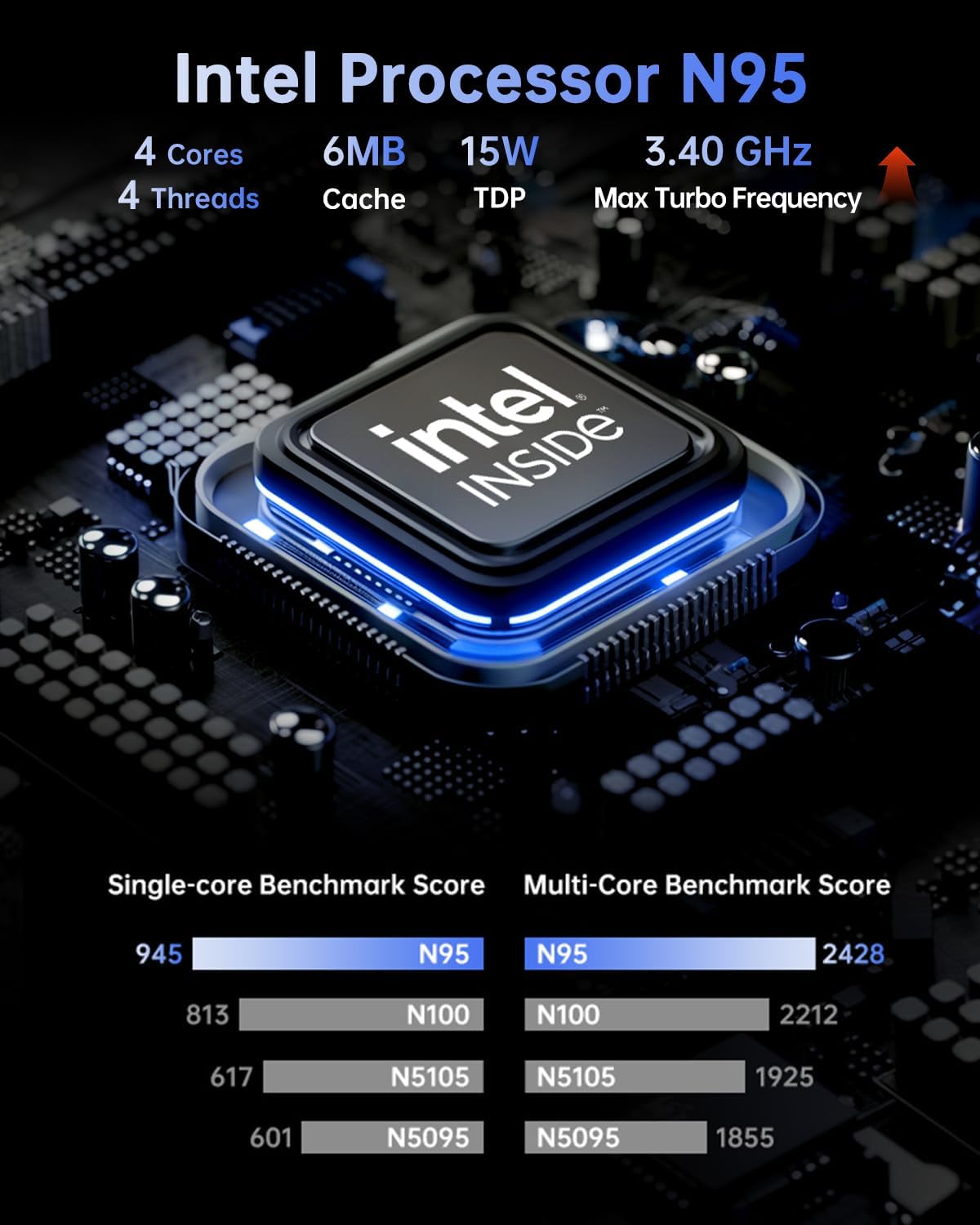 【NEW UPGRADED N95 PROCESSOR】KAMRUI E1 mini pc is powered by 2025 latest Alder Lake-N N95 processor (up to 3.4 GHz, 4 Cores/4 Threads, 6 MB L3 Cache). Compared with (N100/N5105/N5100/N5095), CPU performance +35%, GPU +75%, Whether it’s handling multitasking at work, running smooth HD meetings, streaming 4K videos, or light content creation, it handles it all with ease.
