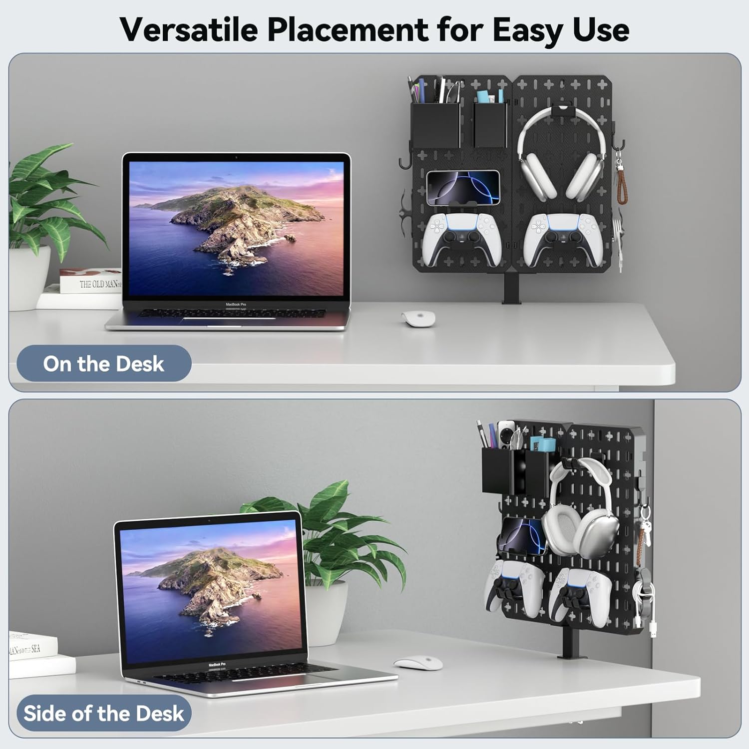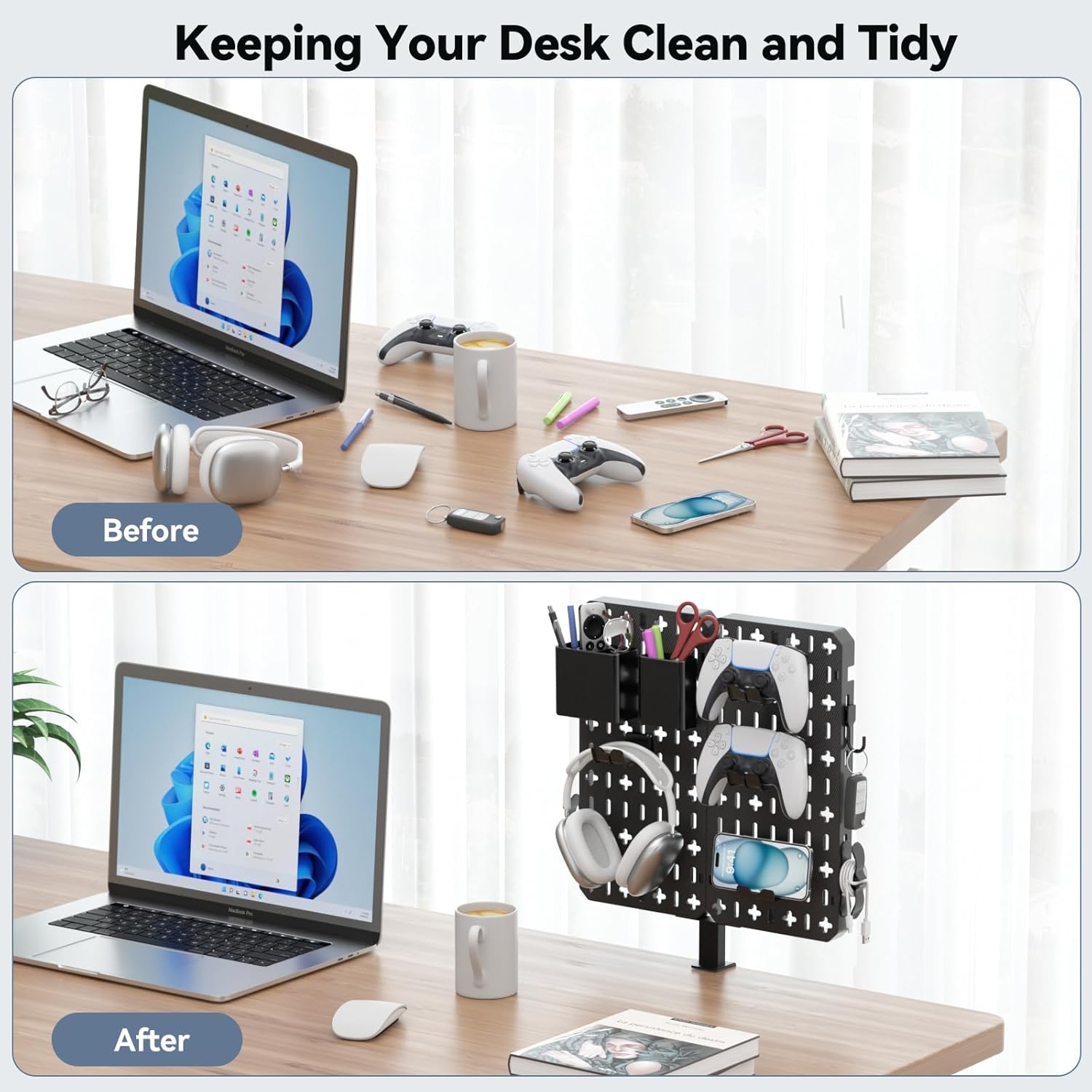 【7-in-1 Clamp-on Desk Pegboard】 This multi-functional desk side storage comes with a phone holder, 3 headphone & controller hanger, 2 different sized of storage box, a removable medium compartment, 2 cable clips and 5 hooks, so that you can easily store headphones, controllers, phone, pens, keys and cable etc.. The clamp-on desk pegboard not only keeps your desk tidy, but also makes it easy for you to quickly find what you need.