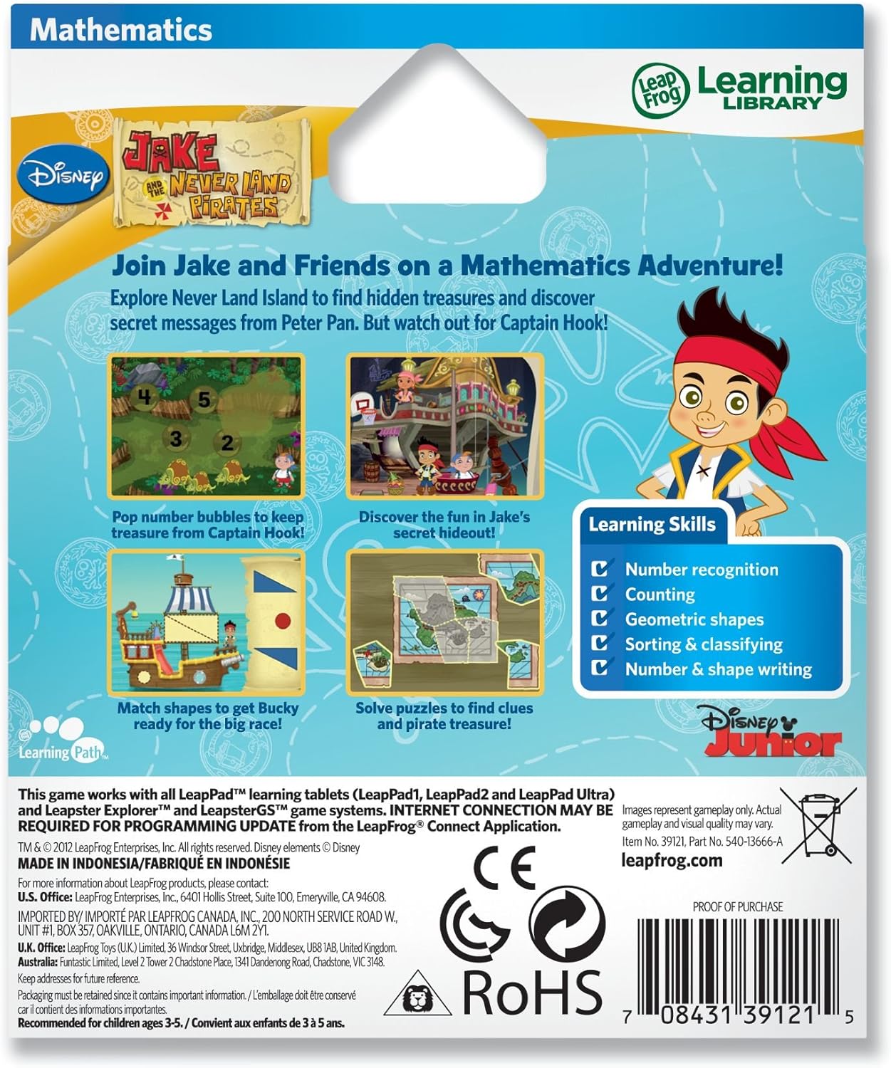 Join Jake and his pirate pals on a magical mathematics adventure in LeapFrog’s Disney Jake and the Never Land Pirates learning game. Explore Never Land to find hidden treasures and discover secret messages from Peter Pan, but watch out for that silly Captain Hook! Gameplay is geared toward kids ages 3-5, and the cartridge is compatible with LeapPad Explorer Learning Tablets, Leapster ExplorerGS and Explorer gaming systems.