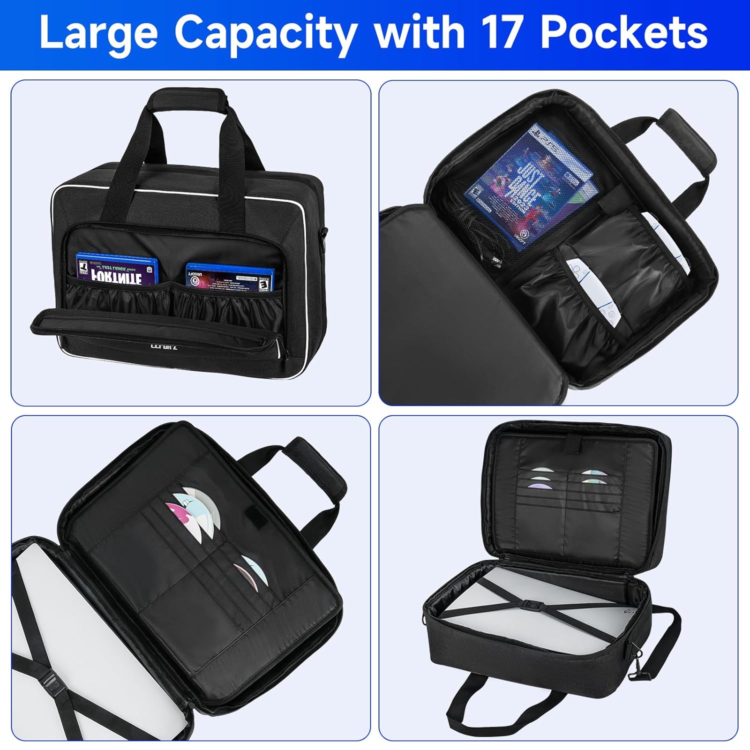 Carrying Case Compatible with PS5/PS5 Pro/PS4,17 Pockets Console Carrying Travel Bag Compatible with Playstation 5/PS5 Digital Edition,Protective Storage Bag for Controller,Game Discs,Charger & Accessories,Black