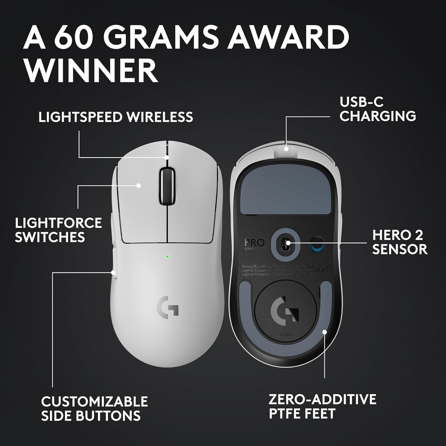 Logitech G PRO X SUPERLIGHT 2 Wireless Gaming Mouse, 60g Pro-Grade with 5 Programmable Buttons, 44k DPI Sensor, 8kHz Report Rate, USB-C Charging for PC/Mac – White