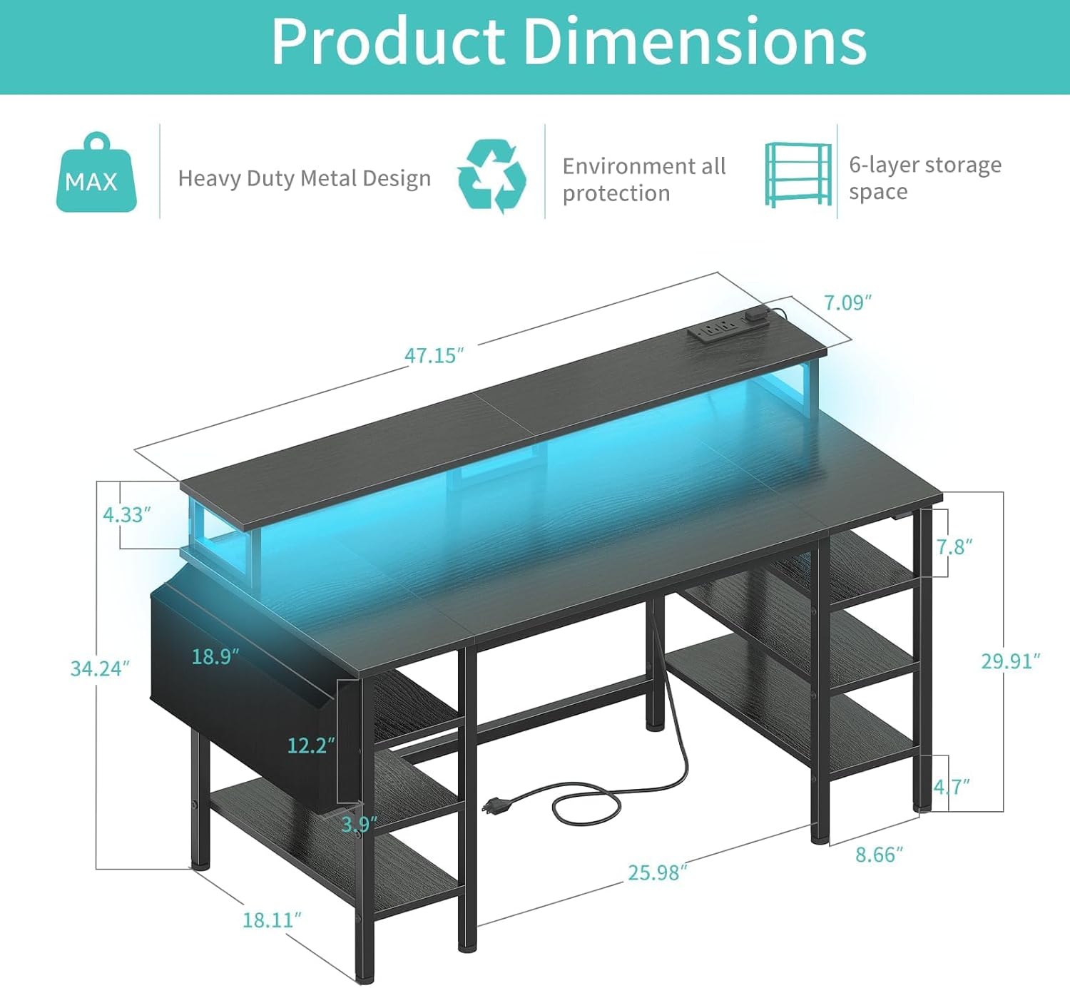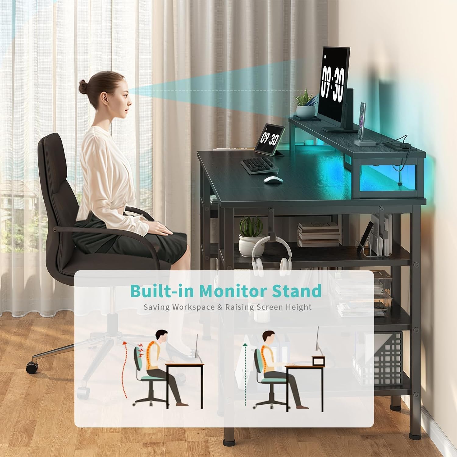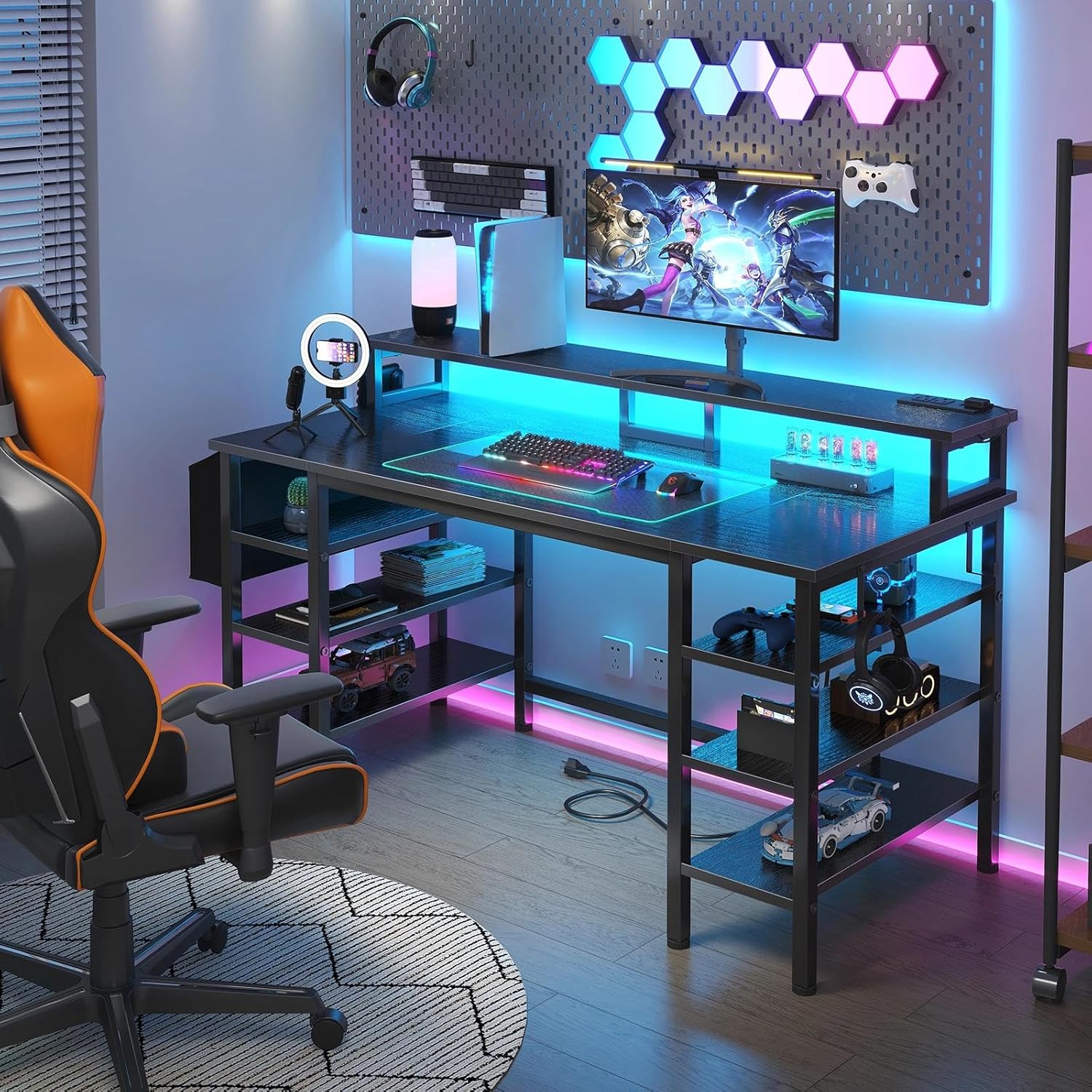 Lufeiya Gaming Desk with LED Lights and Storage Shelves, 47 inch Computer Desk with Power Outlets, Home Office Desk with Monitor Stand, Writing Table PC Desks, Black
