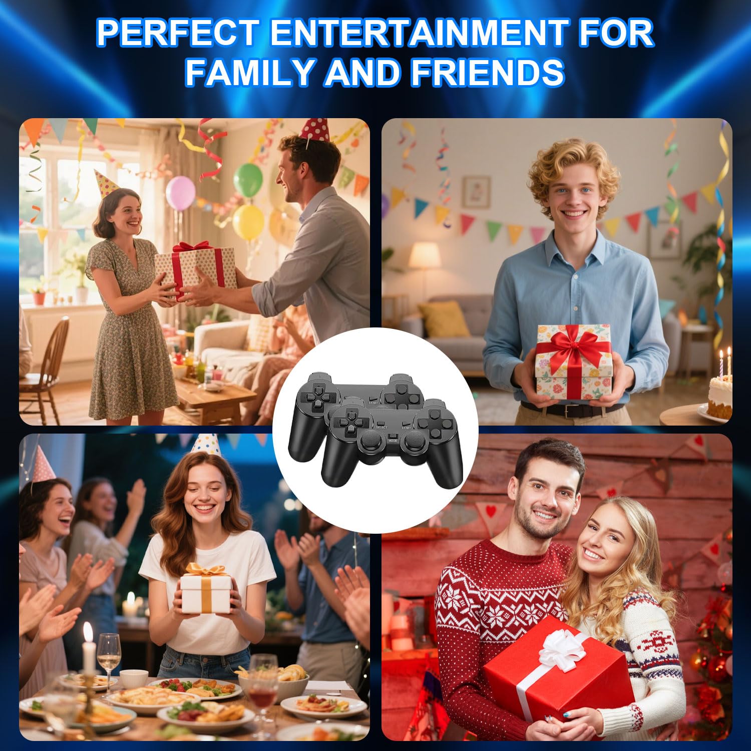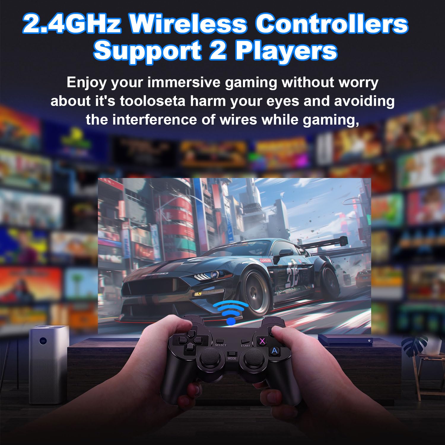 【Enhanced gaming experience】 The game console stick is equipped with two 2.4GHz wireless controllers, ensuring a seamless and immersive gaming experience that combines classic and modern gameplay. The advanced 2.4GHz technology offers excellent response speed and accuracy, allowing you to enjoy uninterrupted and undisturbed continuous gaming sessions.