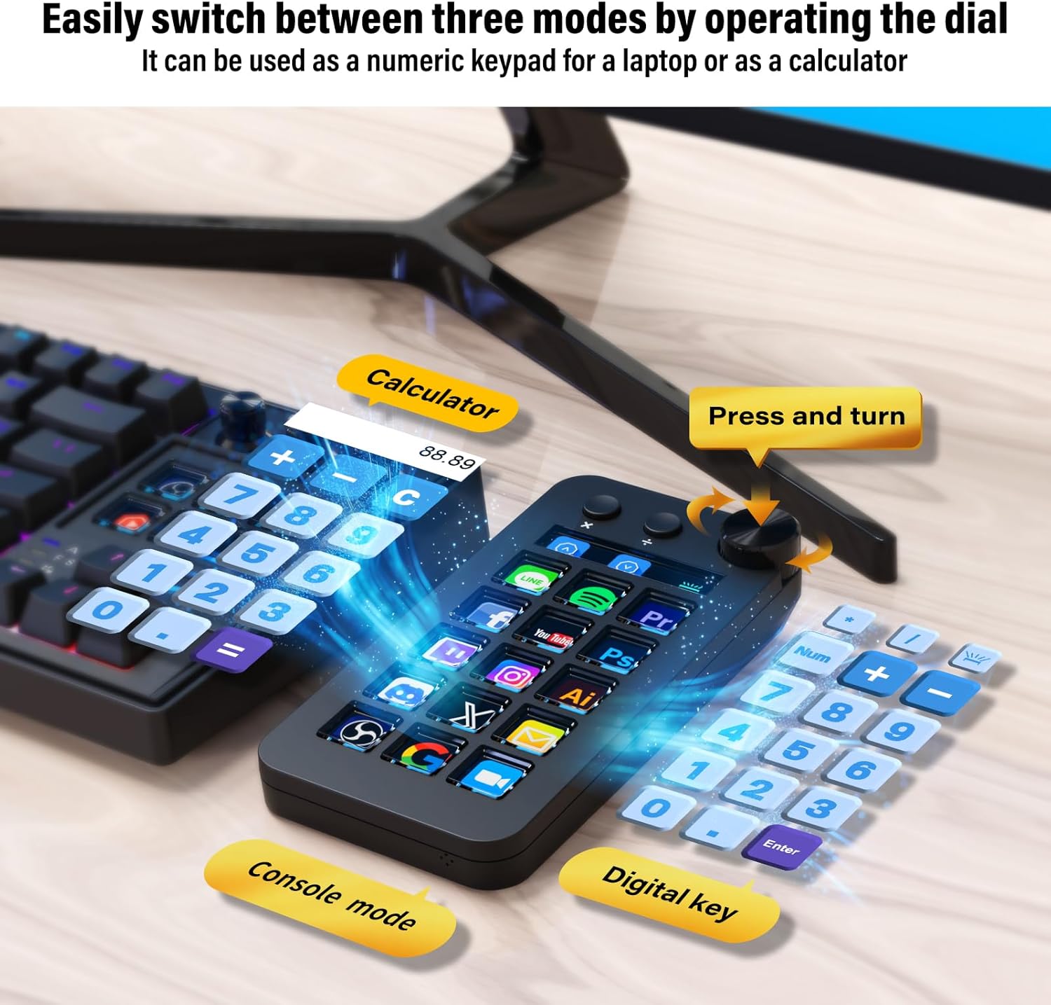 【Left-Handed Numeric Keypad Device】This stream controller deck has three modes: shortcut keyboard, calculator mode, and numeric keypad mode. Shortcut key mode allows you to operate with one touch. Calculator mode allows for easy calculations. Numeric keypad mode supports comfortable numerical input.