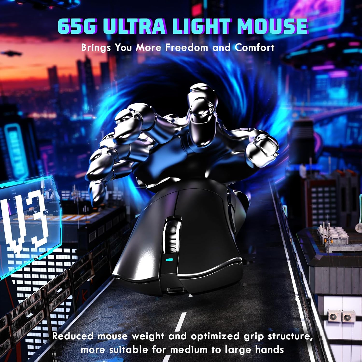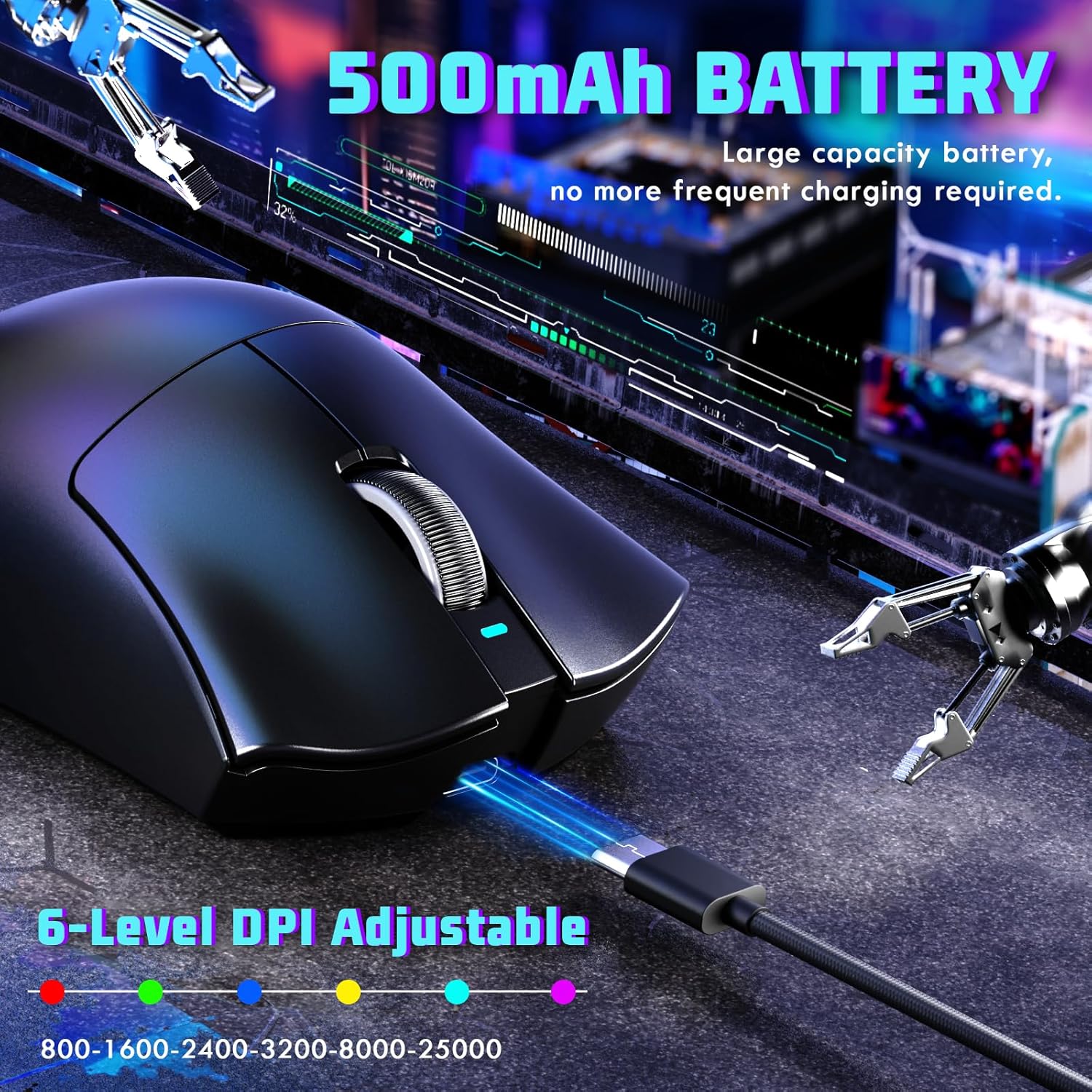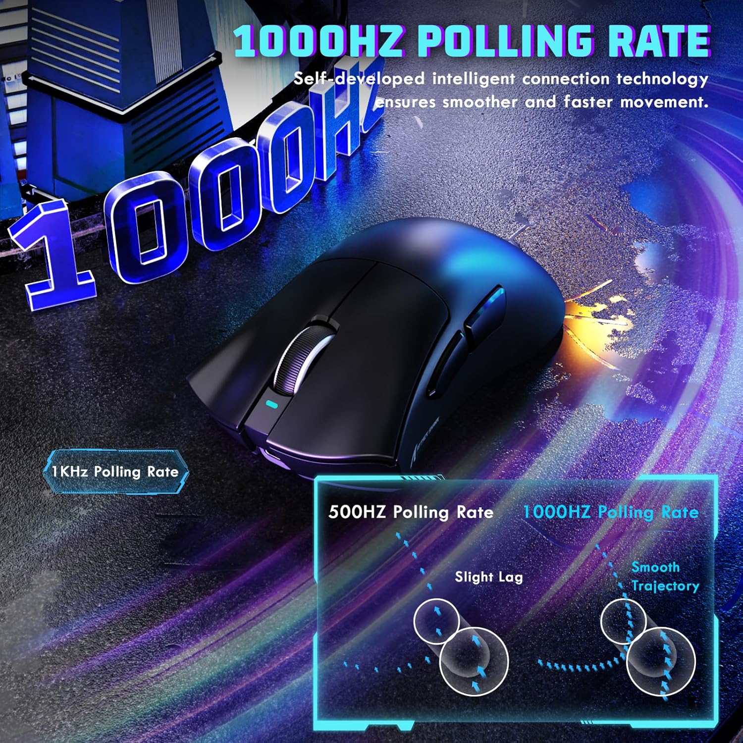 【Tri-Mode Connectivity & 1000Hz Polling Rate】 Seamlessly switch between ultra-fast 2.4GHz wireless, Bluetooth, and USB-C wired modes. With a 1000Hz polling rate (1ms response time), this gaming mouse ensures lightning-fast reflexes and absolute control across your PC, laptop, and other compatible devices.