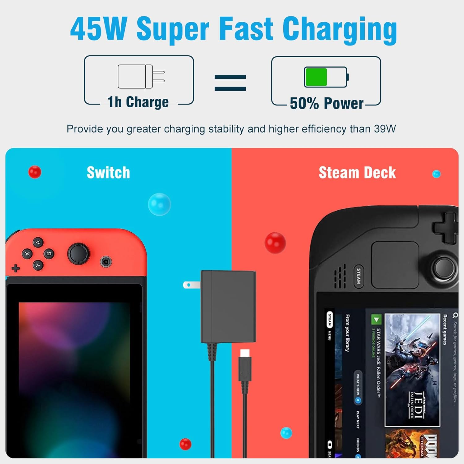 Fast Charging Speed: This 45W ac power adapter can provide high-speed charging for switch/switch oled/switch lite/steam deck. The premium 10FT USB-C cable fits all type-C devices. The charger adapter will charge your switch from 0% to 50% in an hour, which provides you greater charging stability and higher efficiency than 39W
