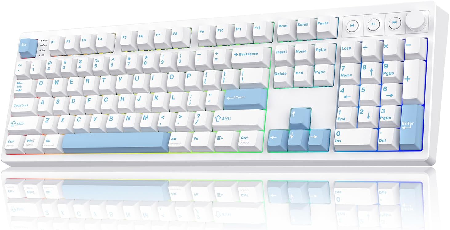 【Full-Size Efficiency: The Ultimate Layout for Productivity and Gaming】The Vibe108 mechanical keyboard boasts a 100% full-size layout with 104 keys, meticulously designed to eliminate compromises between work and play. The inclusion of a dedicated number pad accelerates data entry for professionals, while tactile media controls—play/pause, previous/next track, and volume knobs—offer one-touch command during intense gaming sessions or multimedia tasks. The thoughtful design prioritizes comfort and efficiency, making the Vibe108 the perfect companion for long hours at the desk or in the gaming chair.